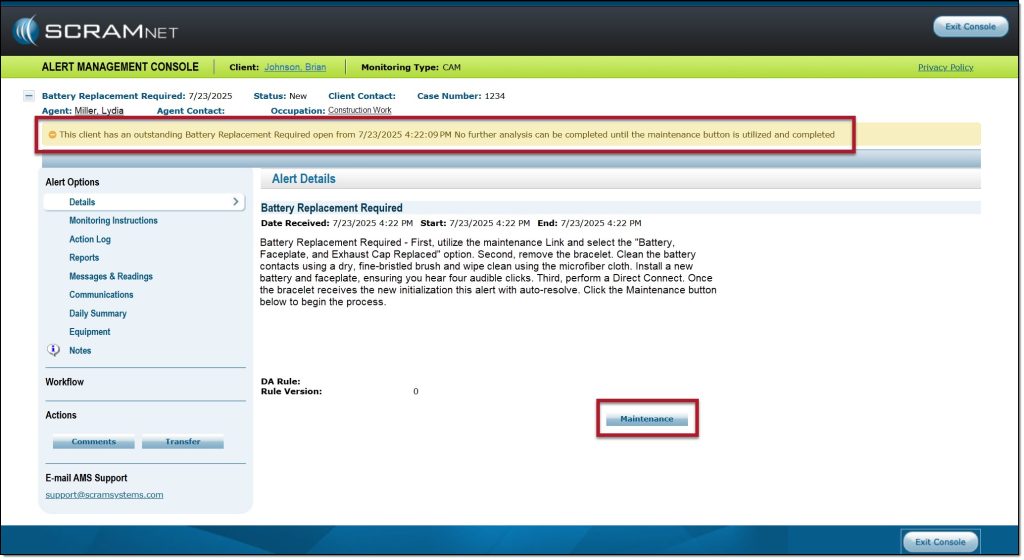 Currently, once a Data Analyst completes their review, the next step for some alerts requires a maintenance activity to be completed to close them. To improve efficiency in both identifying and taking the required actions to resolve these alerts, SCRAM Systems will introduce new alerts that will appear in the Scheduled Maintenance section on the Workload page. Each alert will include the specific actions required to resolve the alert and to ensure proper client monitoring. These new alerts and required actions are: