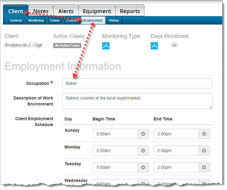 Choose the Client tab, then the Employment sub-tab. Please update the client’s occupation, description of the work environment, and most importantly, the client’s work schedule.
