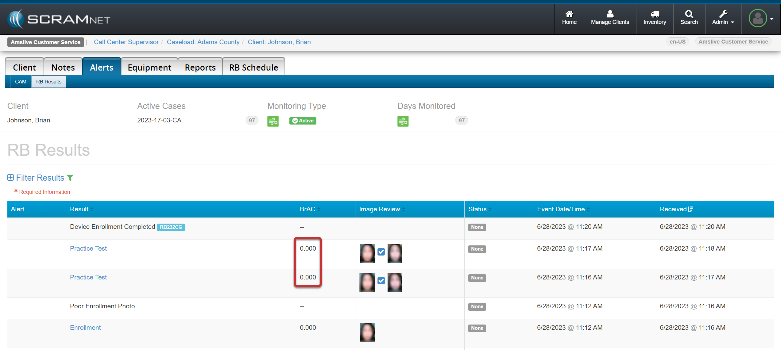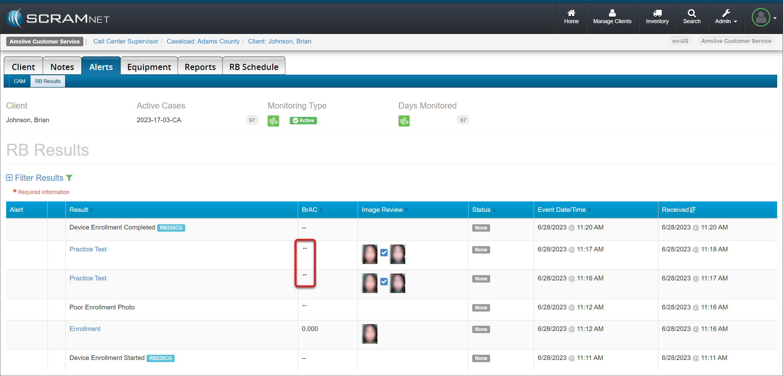 During enrollment, the Enrollment breath test result will still reflect a BrAC value, but the Practice Test breath results will display as “- -” on the RB Results page.