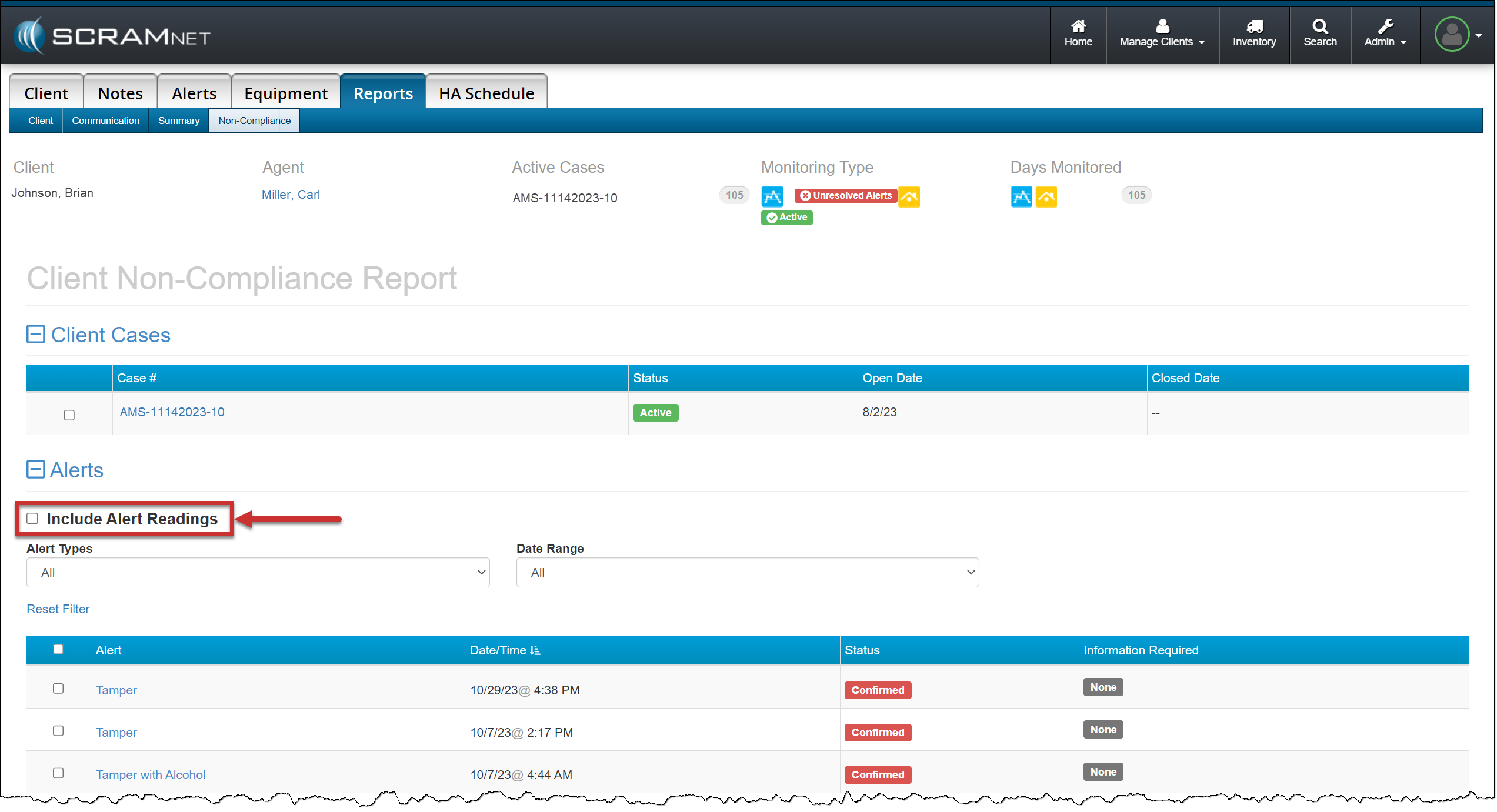 Non-Compliance Report – Add SCRAM CAM alert readings to the report