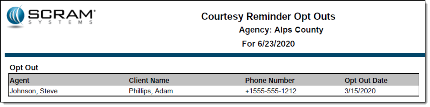 All active SCRAM Remote Breath clients in the caseload who have ever opted out of receiving courtesy reminders will appear on the report.