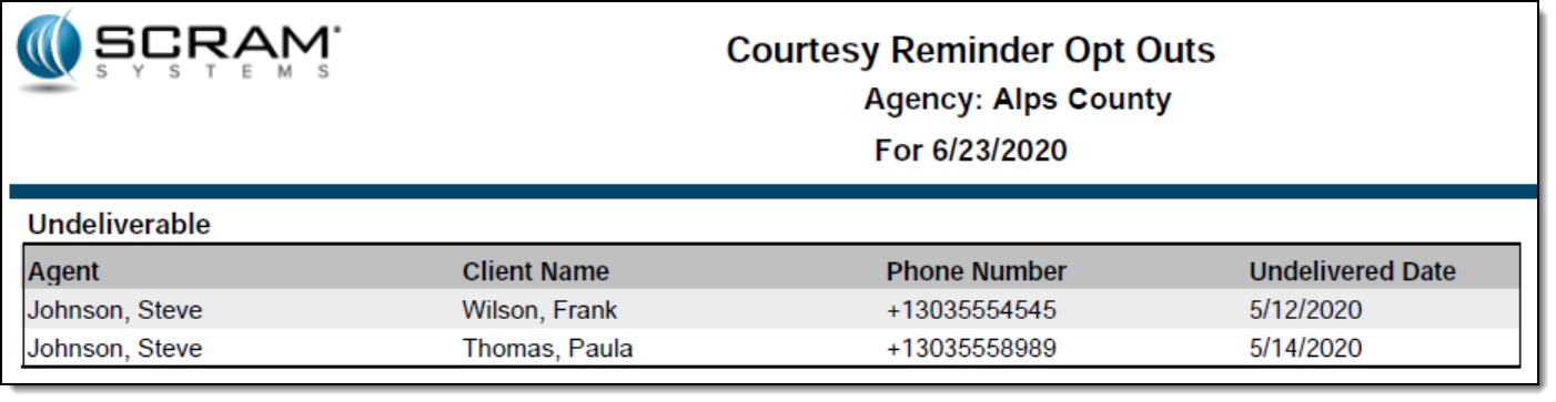 The second page of the report will list each client with an associated phone number that resulted in an “Undeliverable” message being generated when a courtesy reminder was sent.