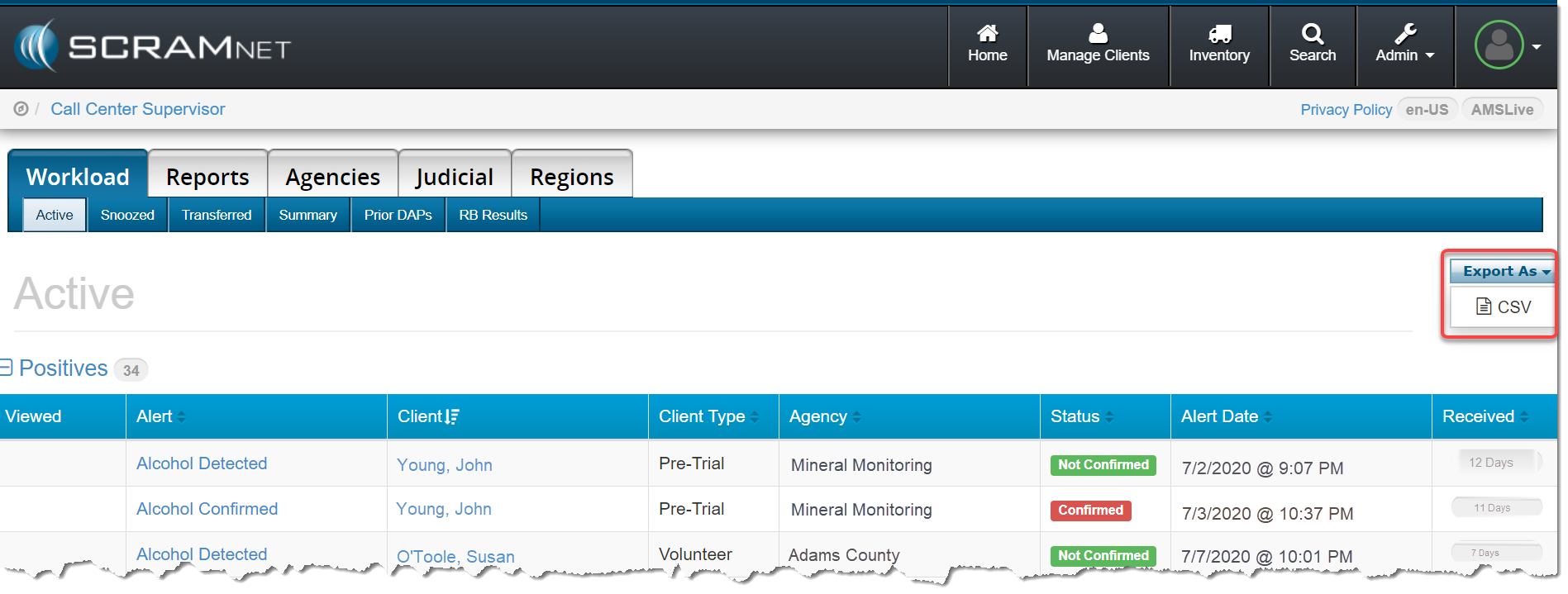 With this release, you can now export the data that appears on any Workload page in SCRAMNET® to a.csv-format spreadsheet file. To do this, click the Export As button then click the “CSV” option.
