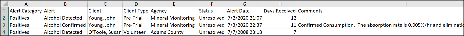 Once the .csv file is downloaded to your computer, you can open the file in any popular spreadsheet editing program and easily modify the list as needed. Any comments entered for the case will appear in the “Comments” column.