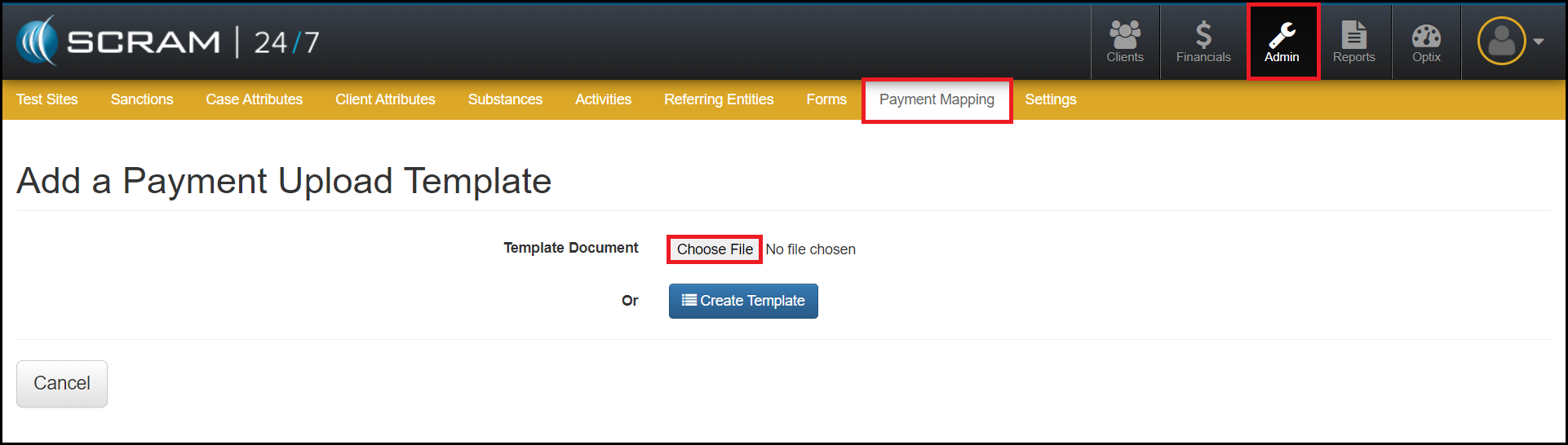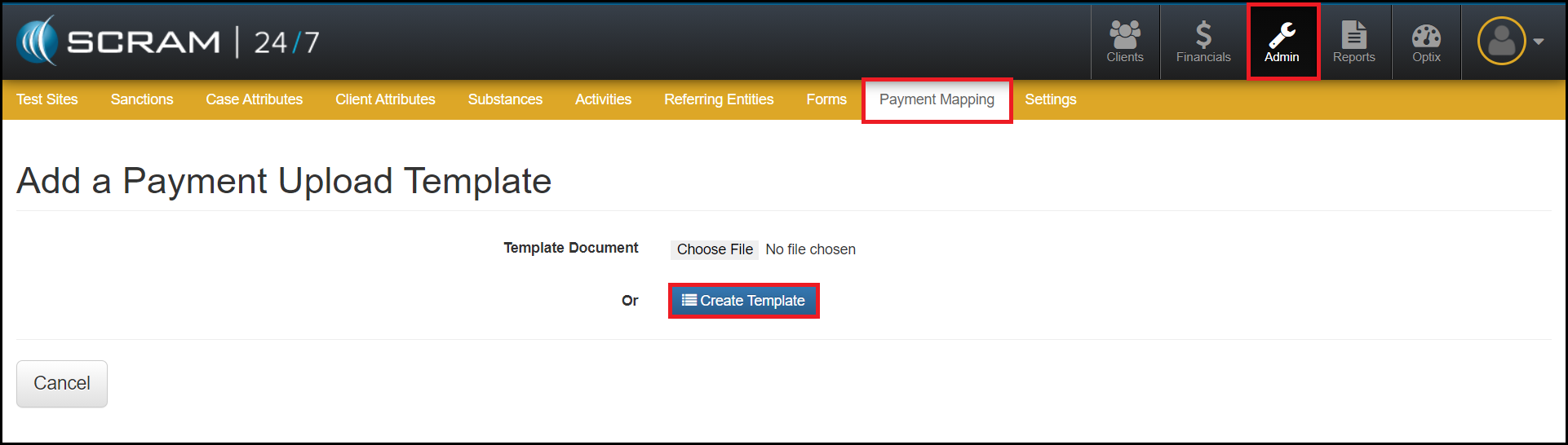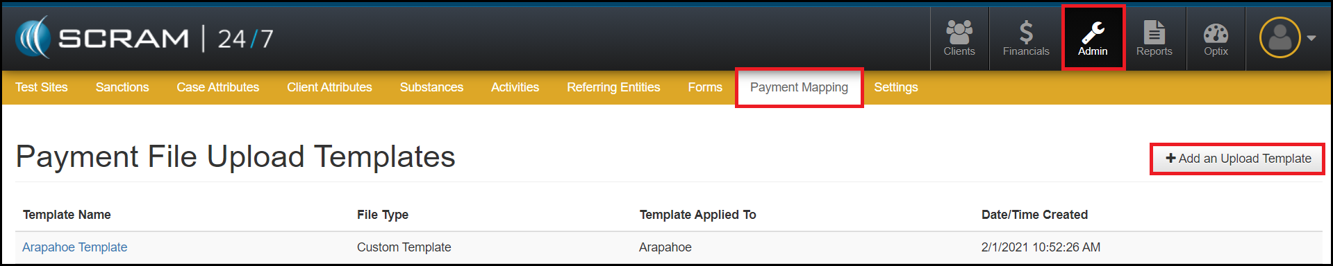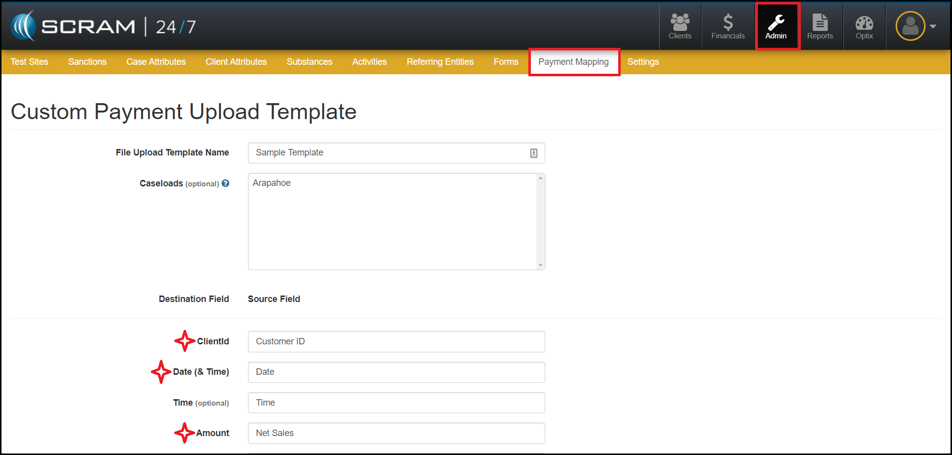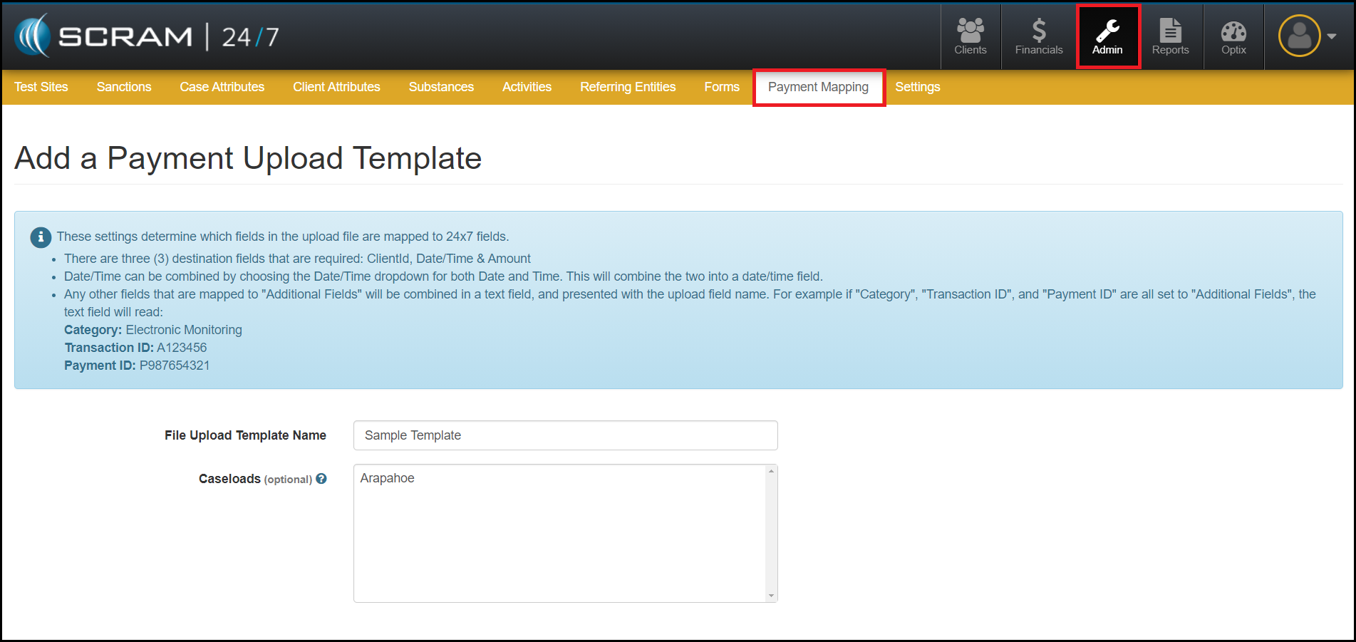 - To begin, navigate to the Admin facility within the SCRAM 24/7 software and select the Payment Mapping tab.