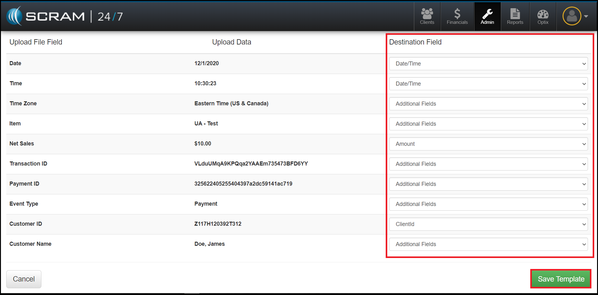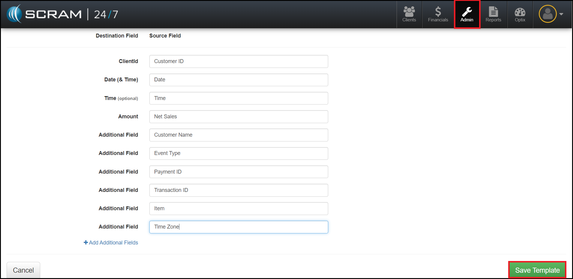 - Once the Destination and Source fields are matched, select the Save Template button.