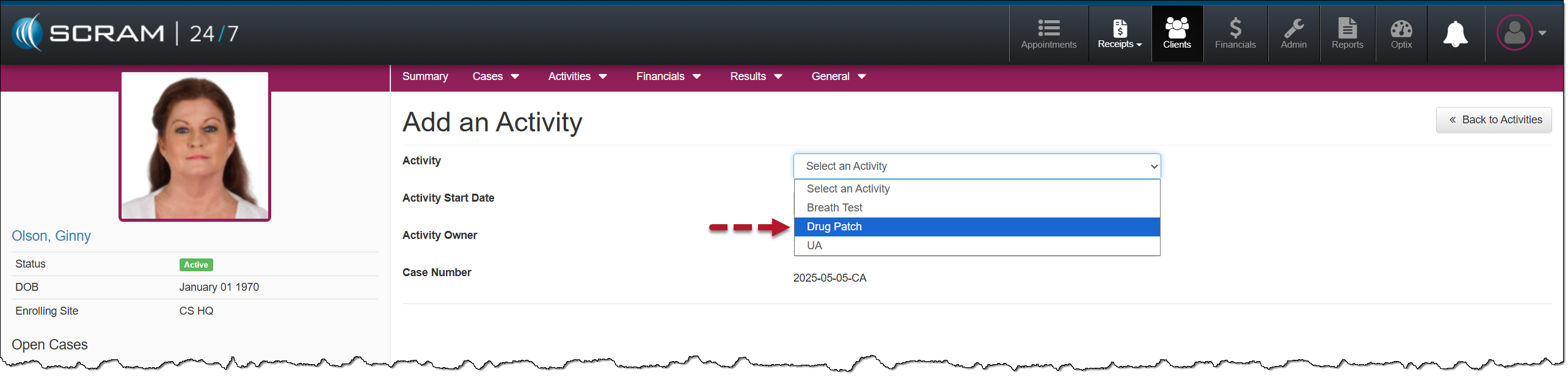 - Open the Activity dropdown menu, and select the Drug Patch option.