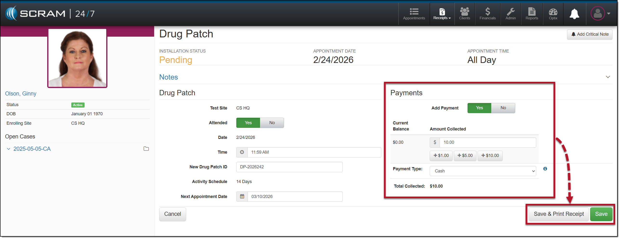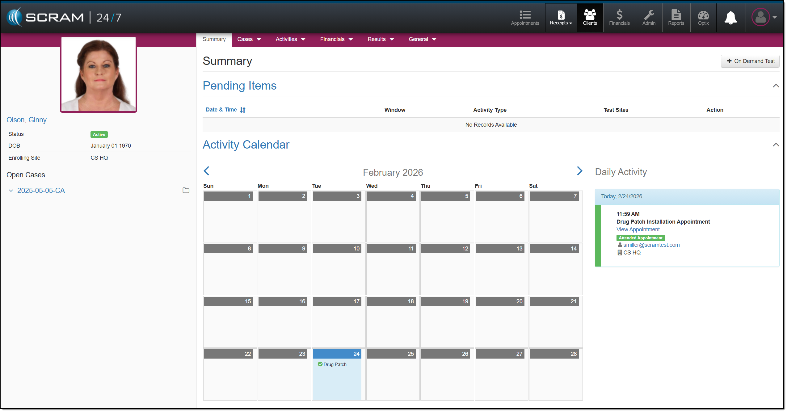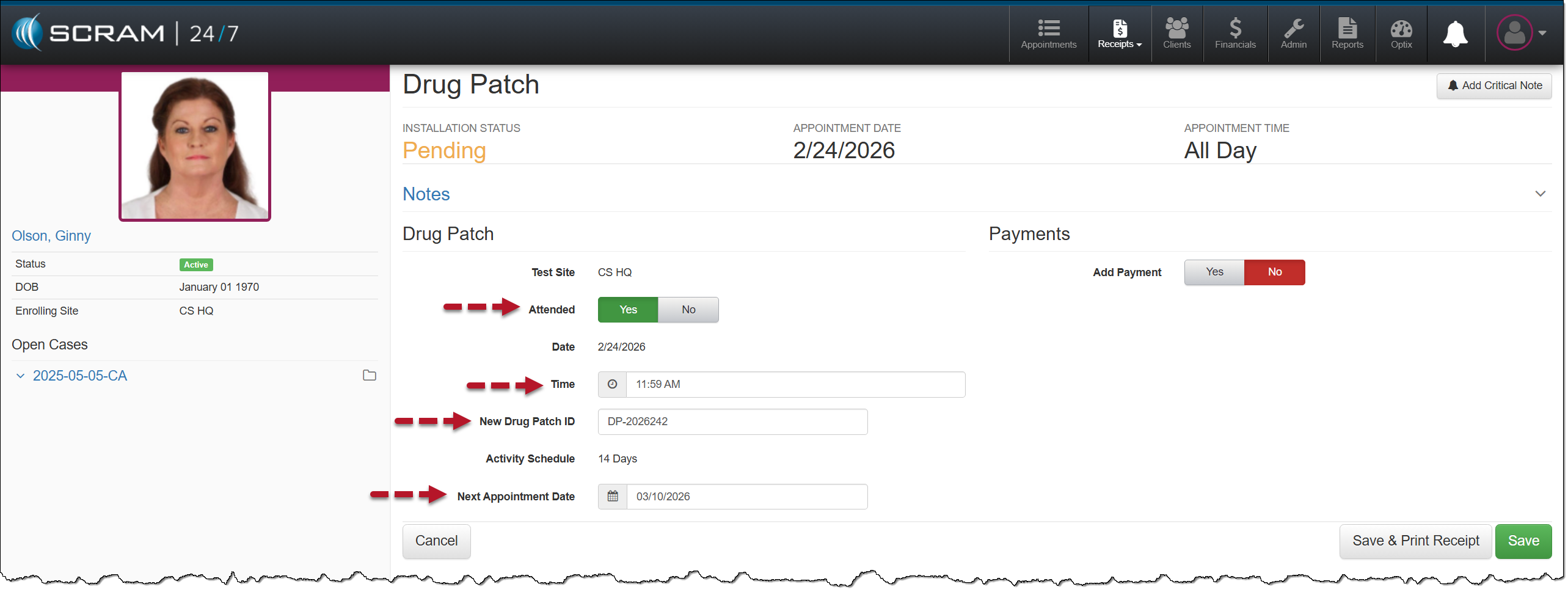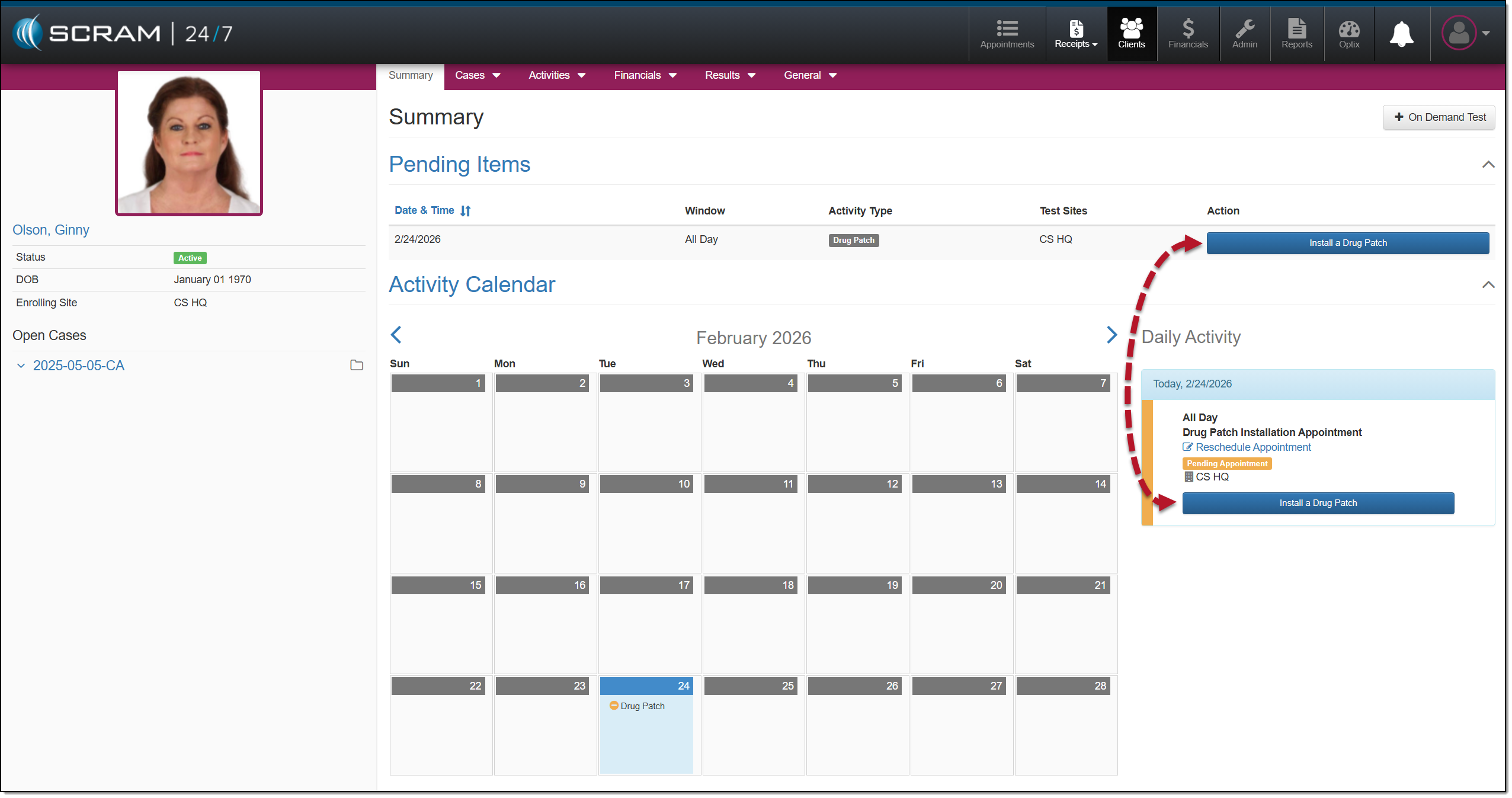 The client’s Summary page will display an Install a Drug Patch appointment.