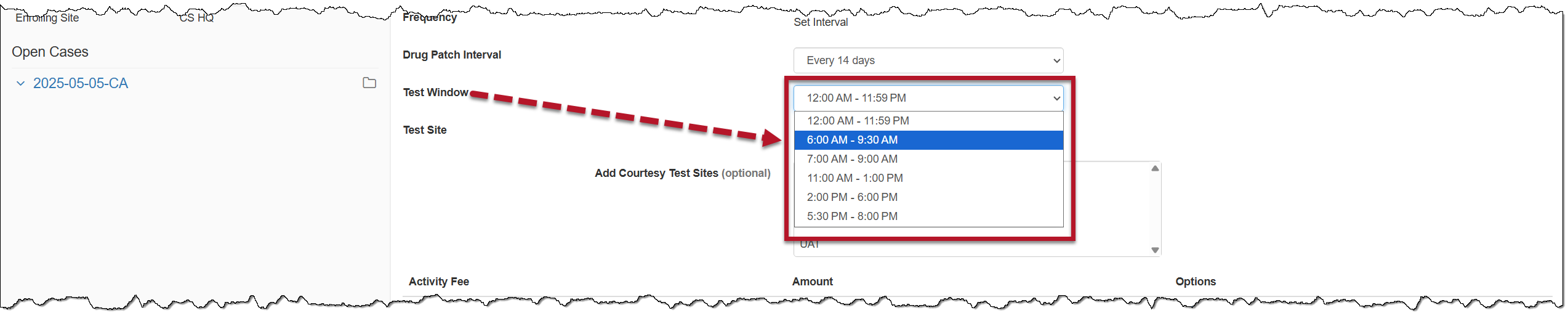 - Open the Test Window dropdown menu and select the appropriate option. This is the appointment window.