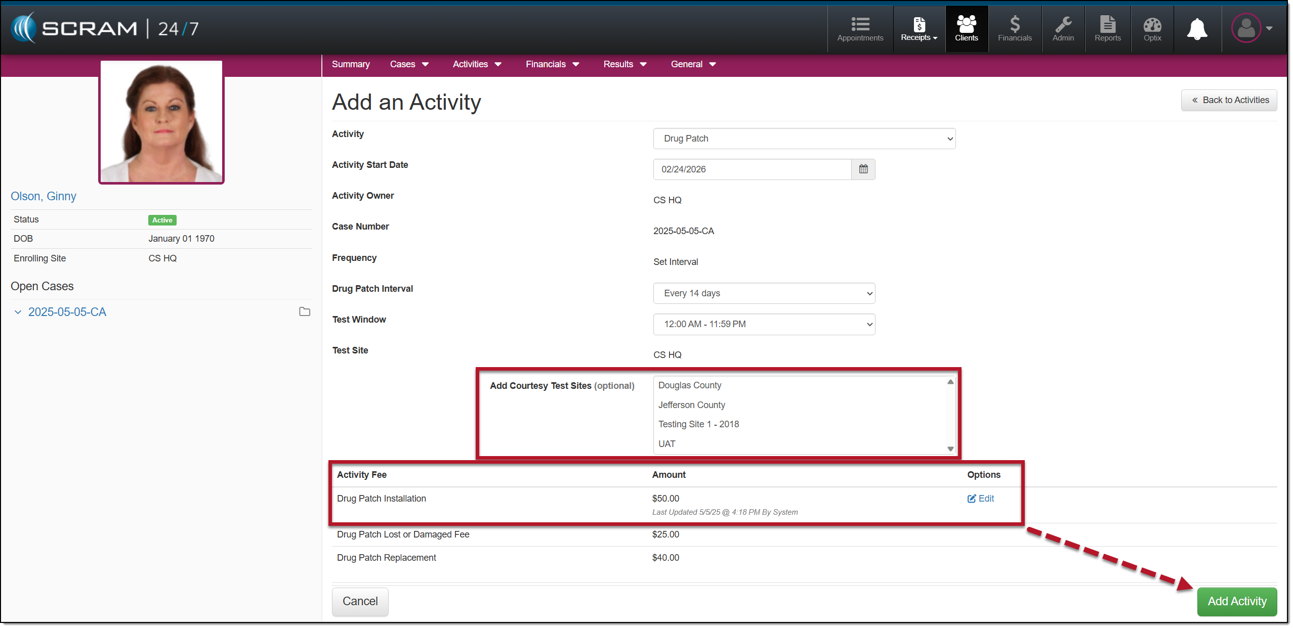 - After entering the details for the Drug Patch Activity, select the Add Activity button.