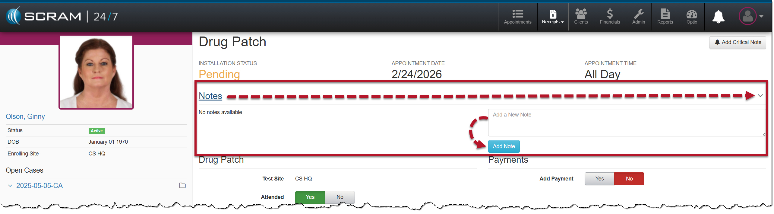 - On the Drug Patch appointment page, you may add a note by expanding the Note section.