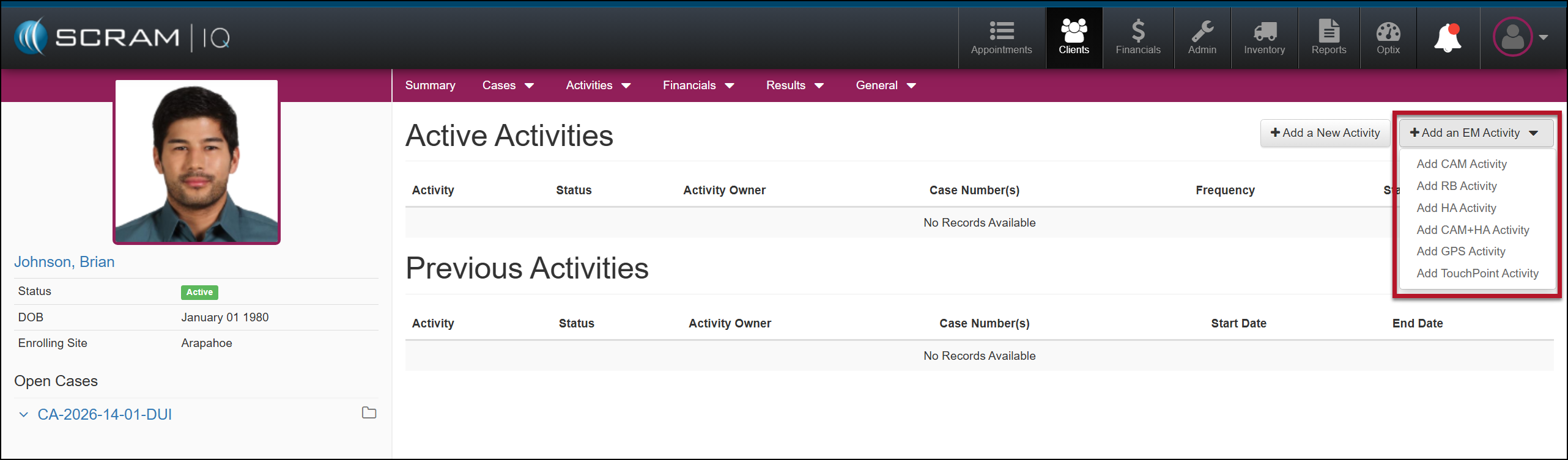 Active Activities page with Add Activity buttons for EM and Non-EM Activities.