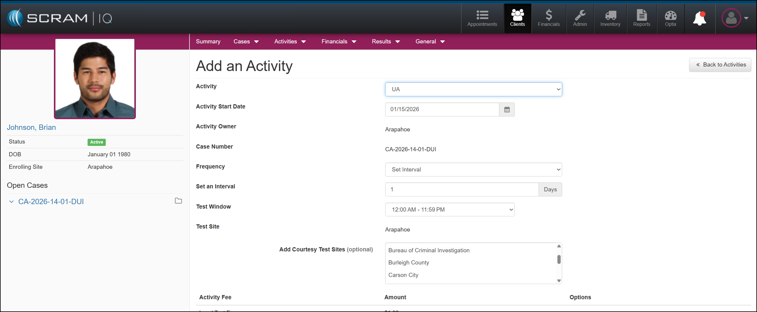 After selecting your Activity, you will walk through the Activity setup process. For example, creating the Activity Schedule for sobriety testing or in-person meetings, monitoring fees (when applicable), or assigning EM equipment for monitoring.