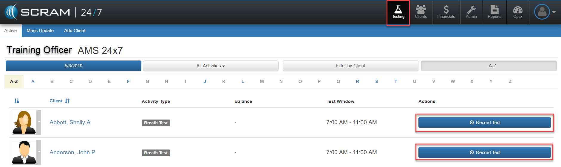 For clients on the program being supervised via breath testing, there are two main ways to initiate the testing sequence. First the officer can locate the client by navigating to the Testing page located via the top Testing navigation icon and search and locate the client. From there a blue Actions button can be selected to launch the testing and payment process.