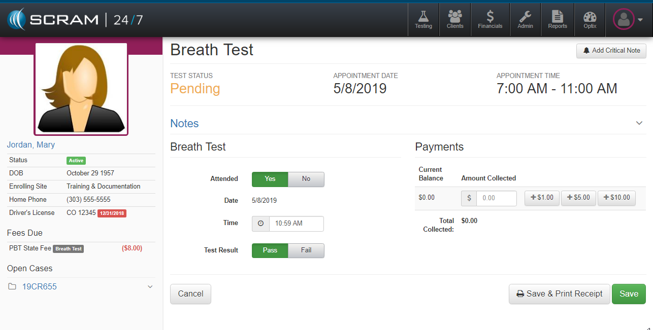 If payment is received during the test, the office can document the amount remitted by the client by manually entering the amount or clicking on one of the payment denomination buttons. The officer can complete the test either by clicking the Save & Print Receipt or green Save button in the lower right.