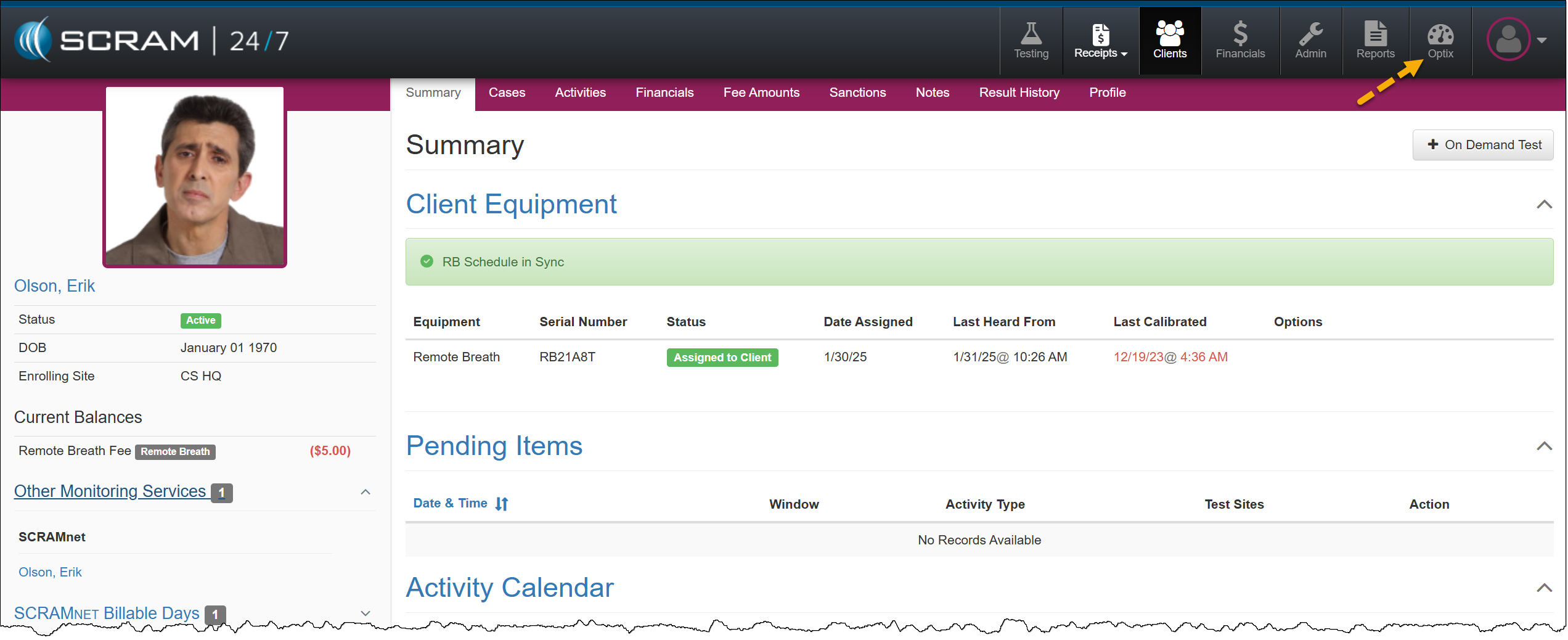 - Within SCRAM 24/7, select the Optix button.