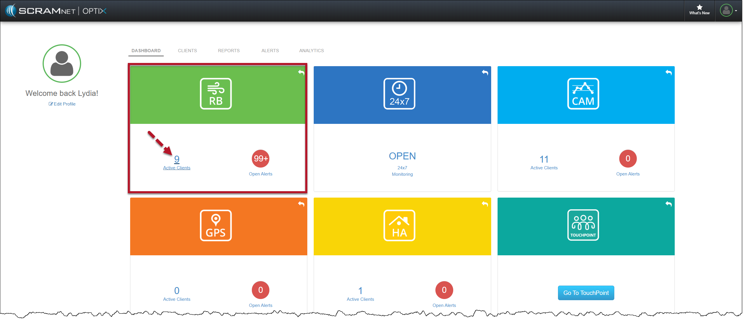 - On the Optix Dashboard, select the Active Clients hyperlink on the Remote Breath tile.