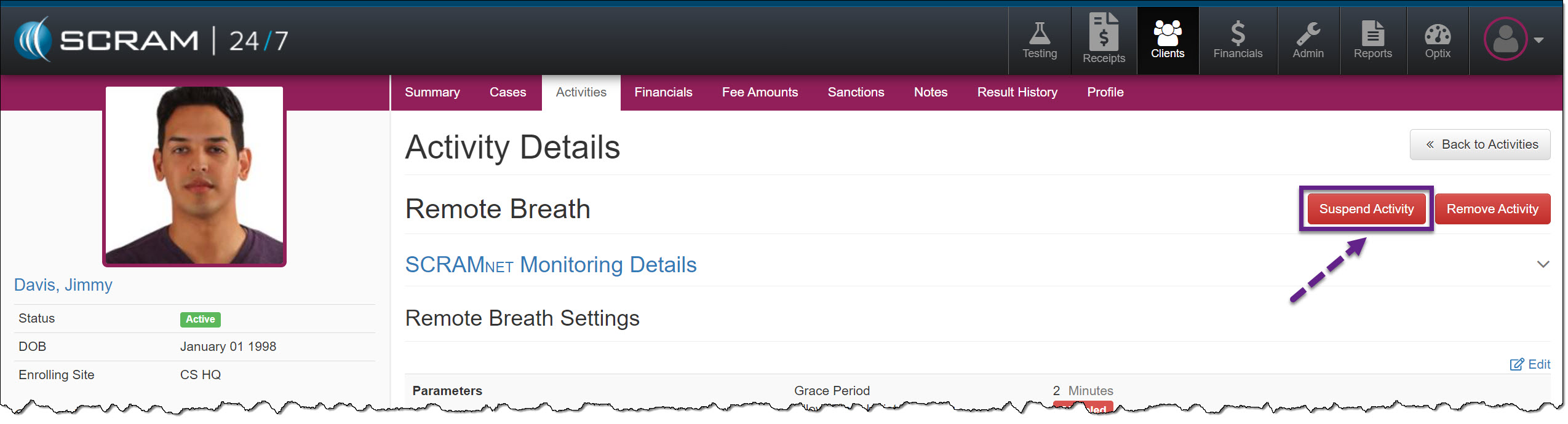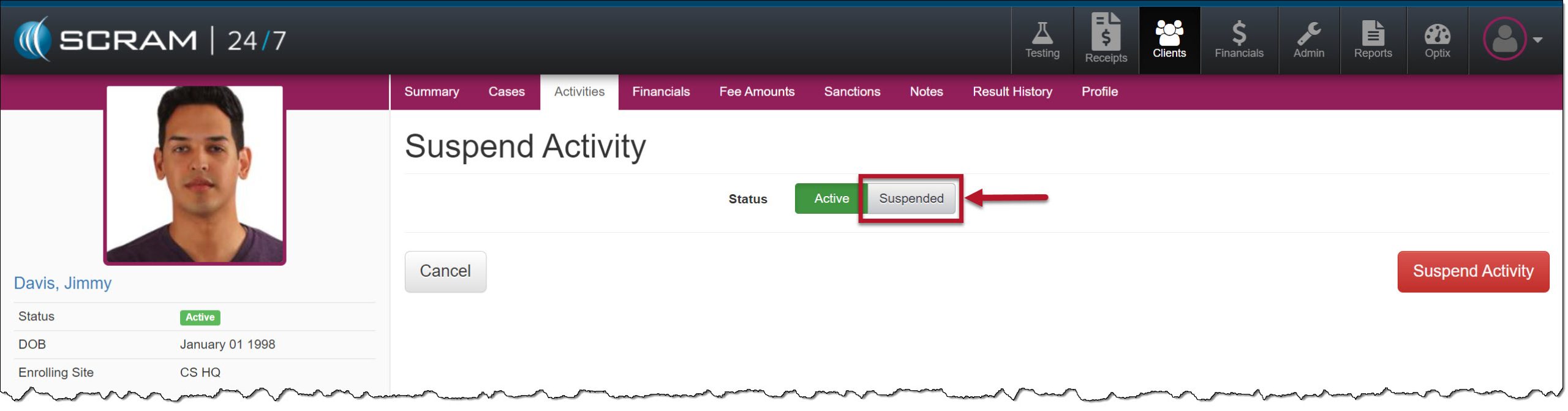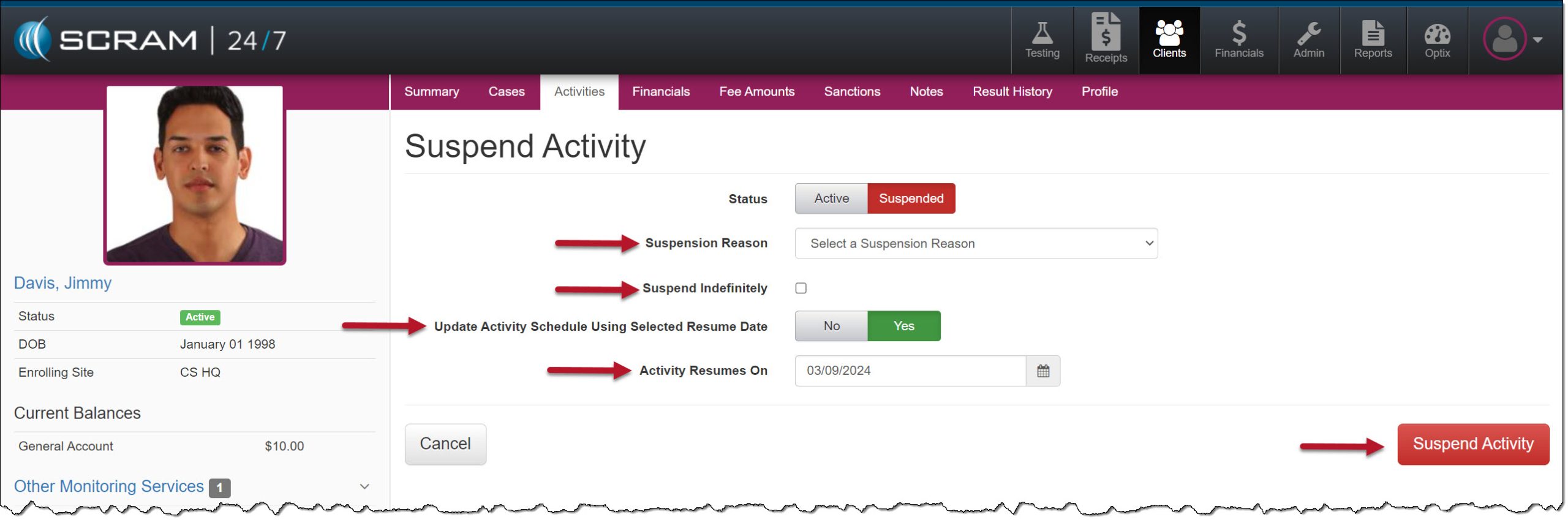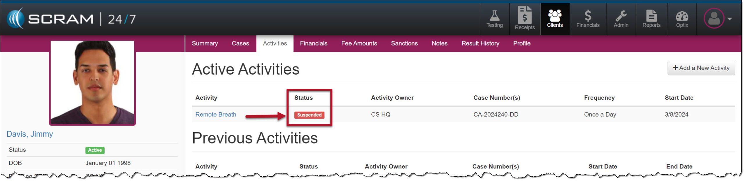 - Select the appropriate suspension details and verify the Activity Resume On date.