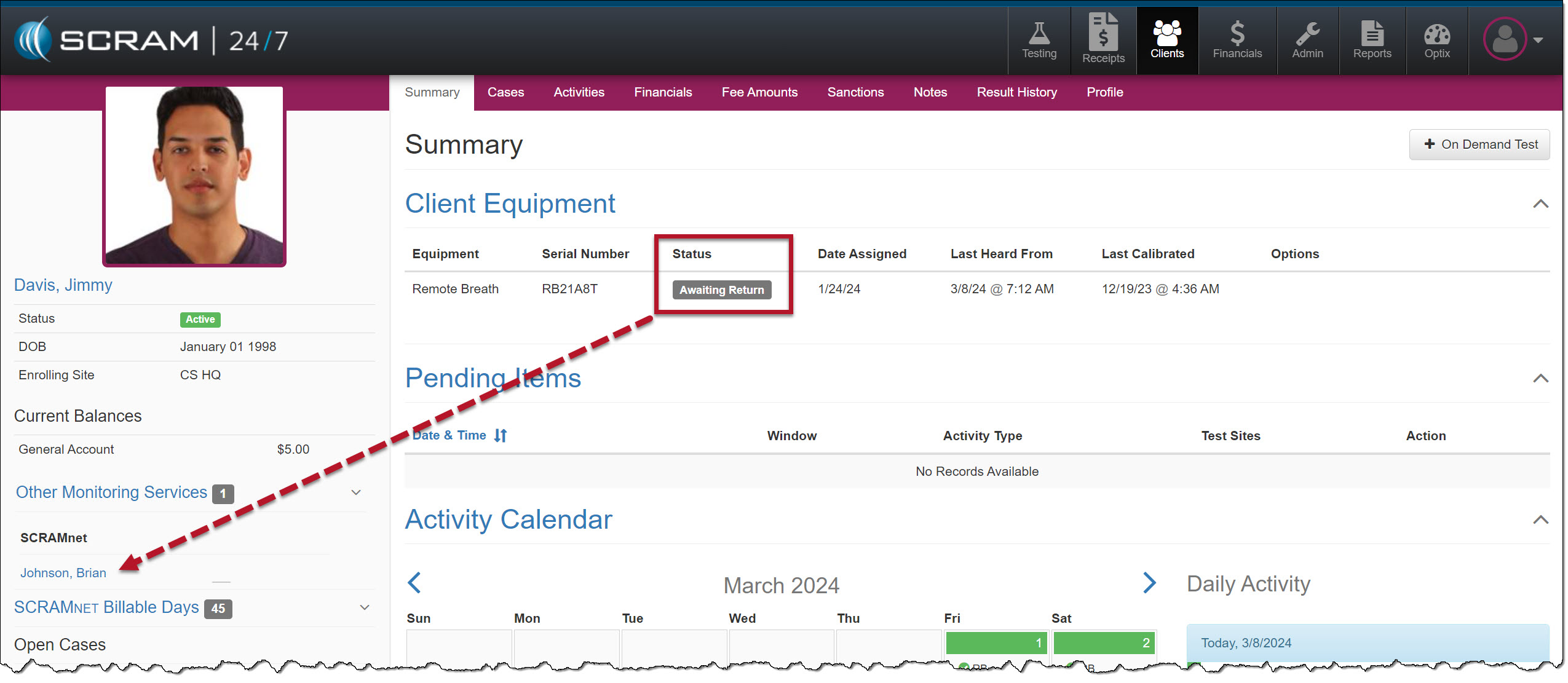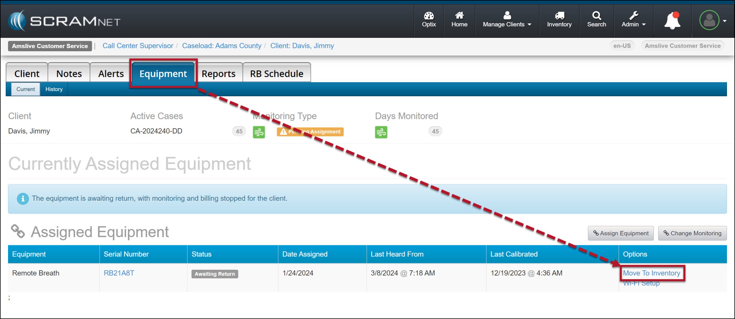 The equipment is now in an “Awaiting Return” status on the Summary page. When the device is recovered, navigate to the client’s Equipment page in SCRAMNET and select the Move to Inventory hyperlink under the Options column to update the device status from “Awaiting Return” to “In Inventory.”