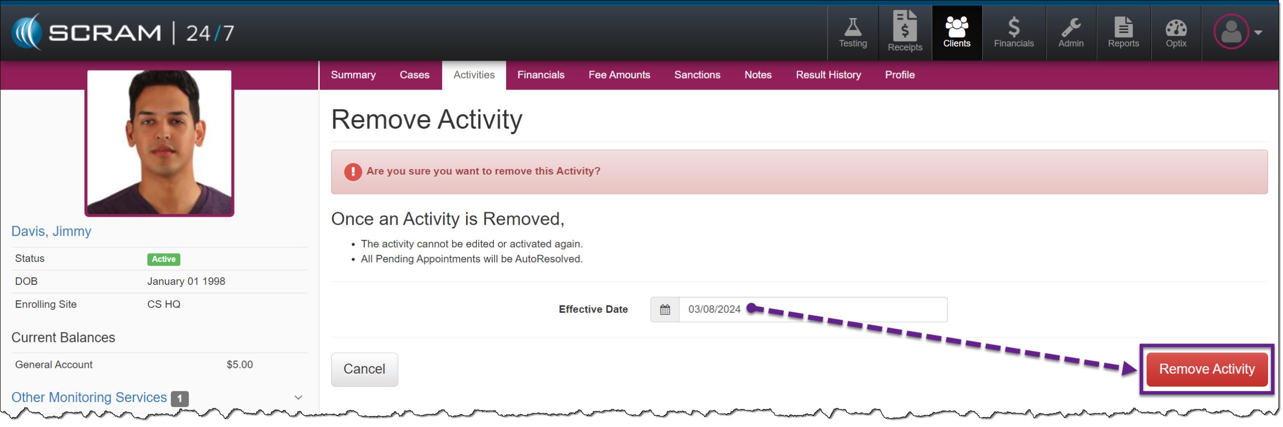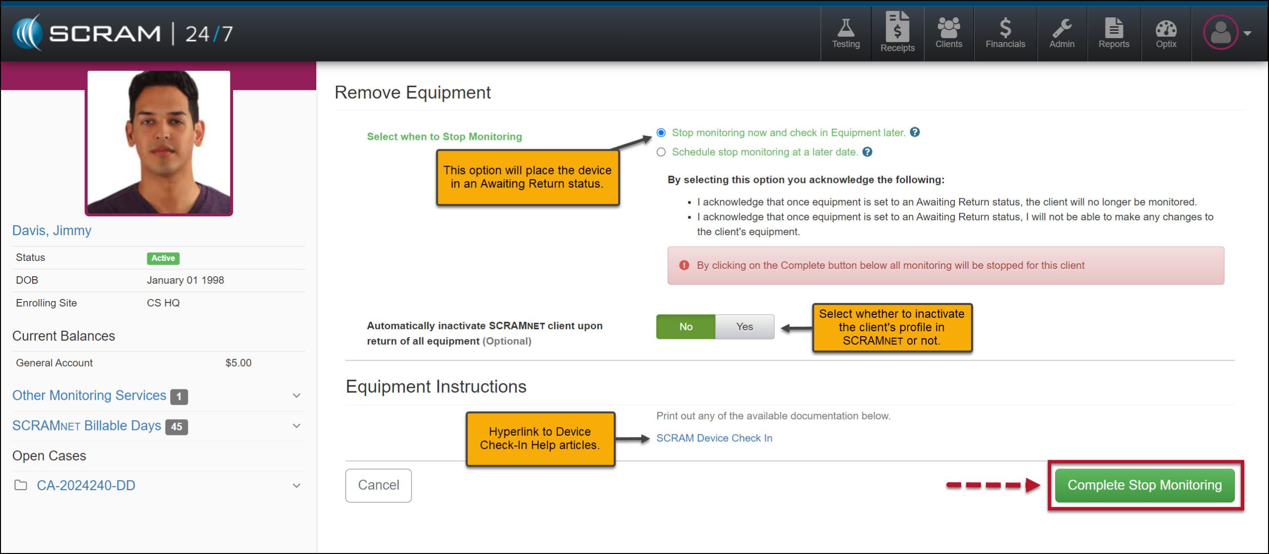 - On the Remove Equipment page, select when to stop monitoring the client and whether to automatically deactivate the SCRAMNET profile once the equipment is checked in.