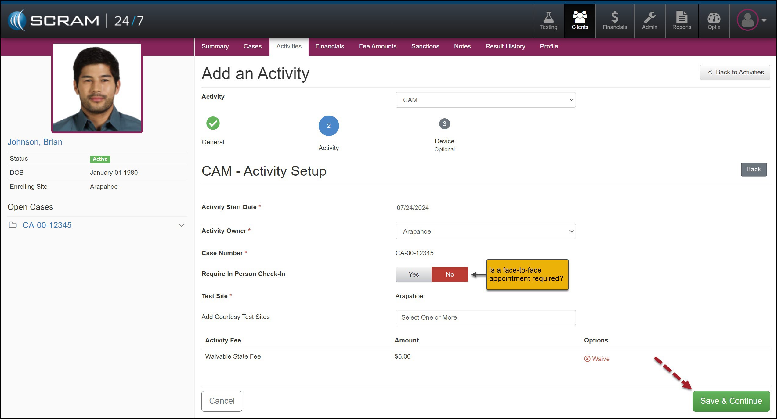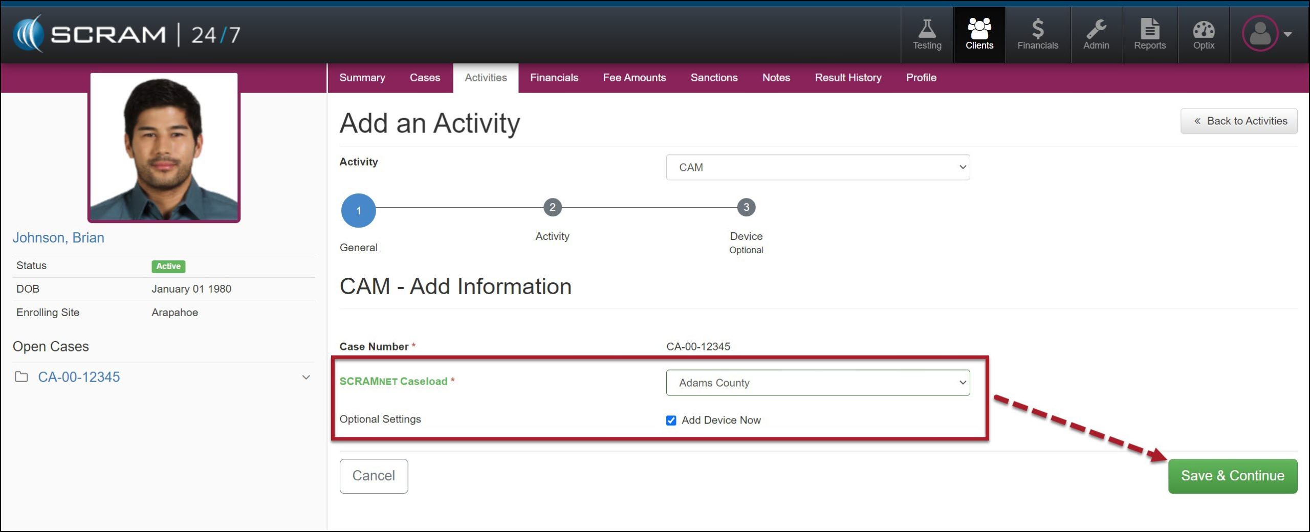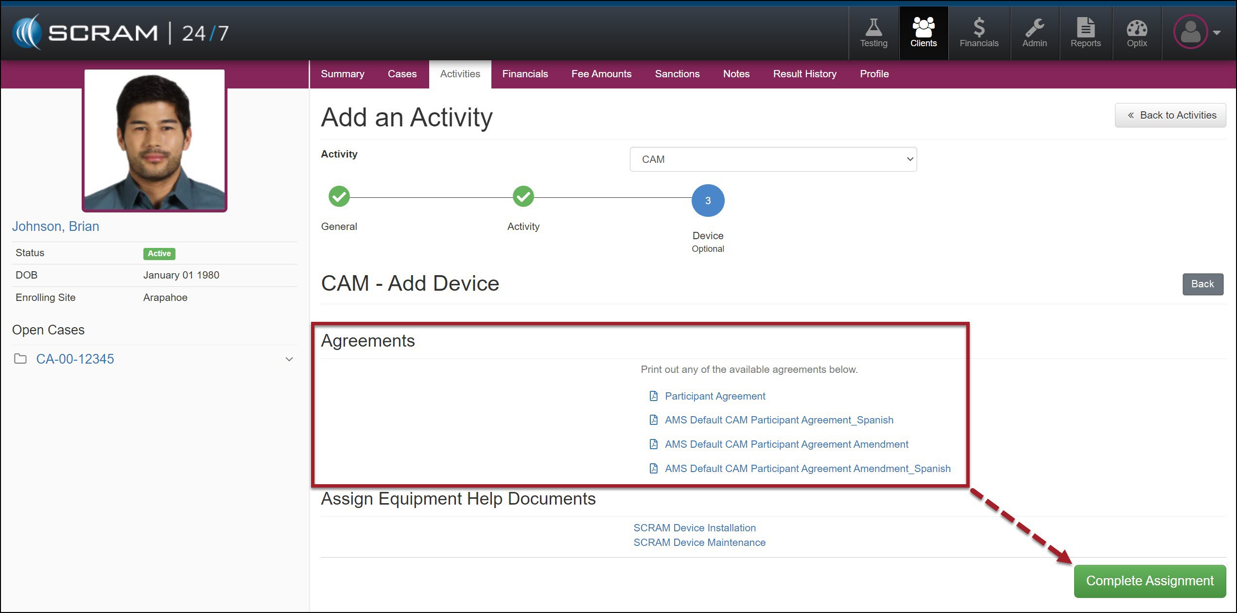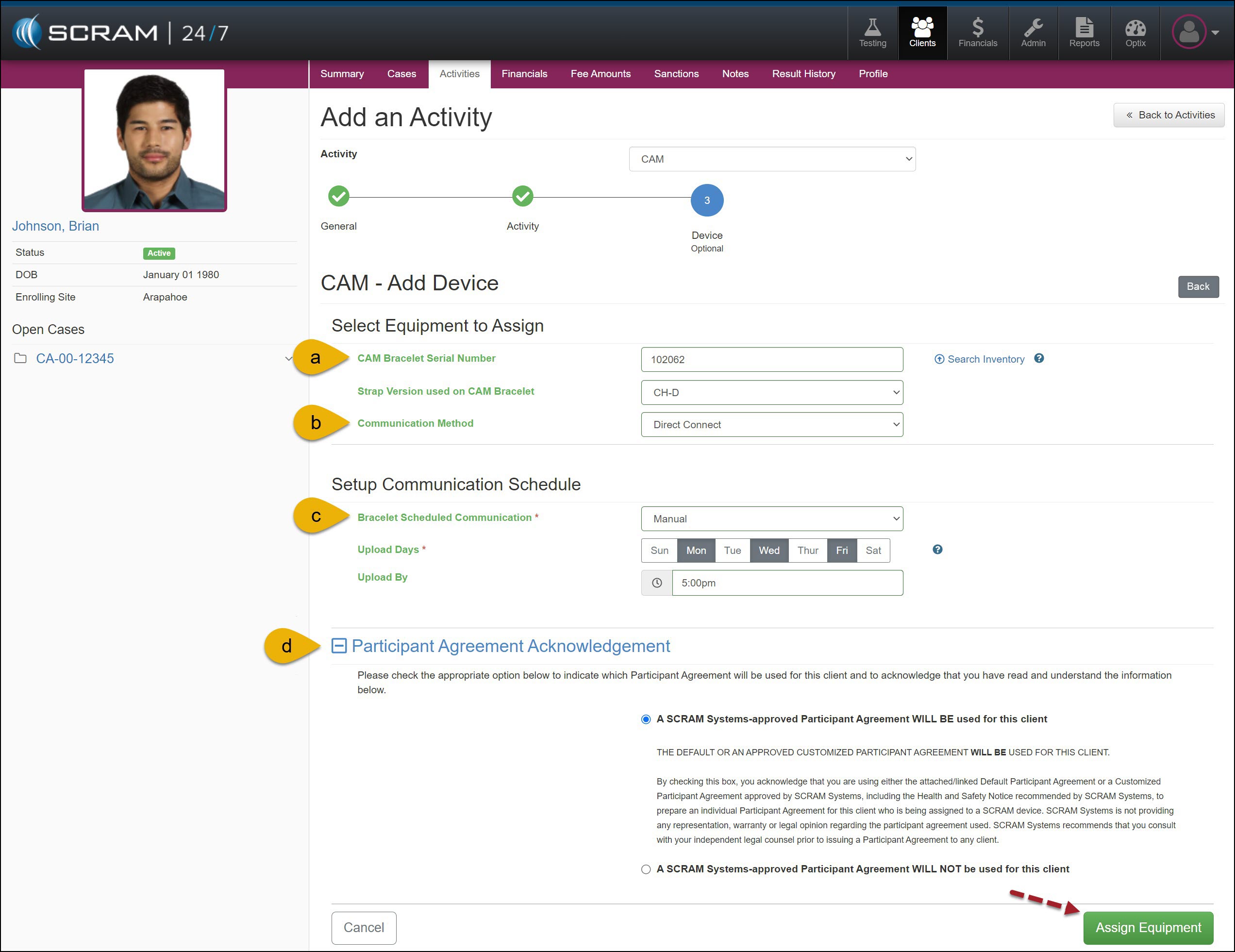 Once you have created the client’s profile in SCRAM 24/7, add the CAM Activity and complete the equipment assignment.