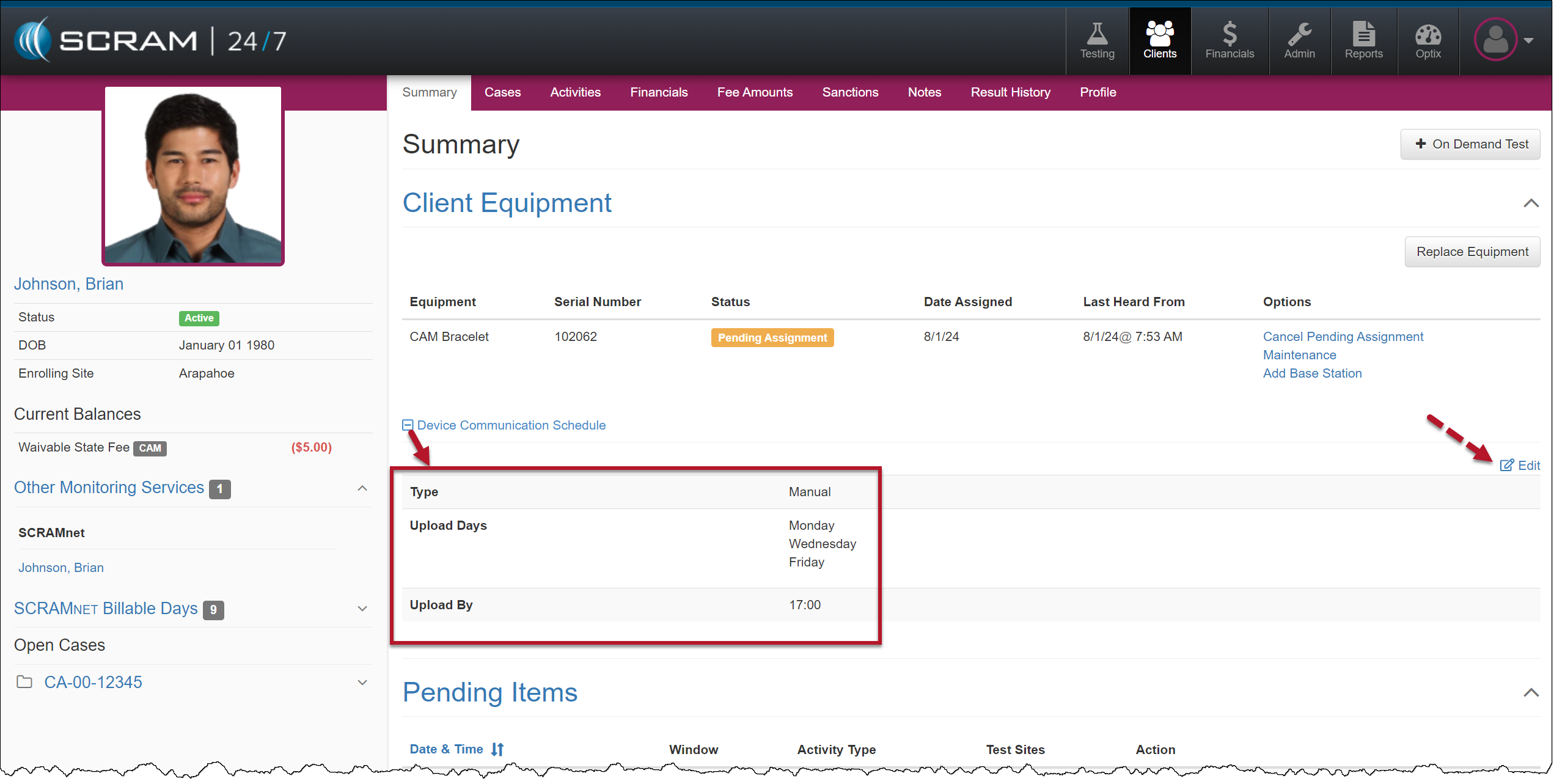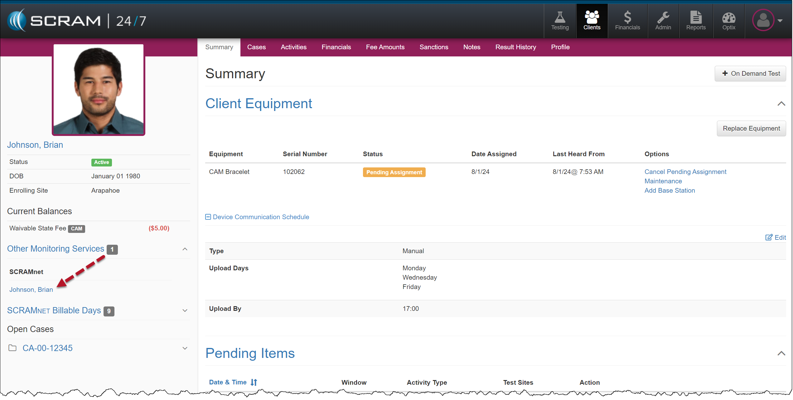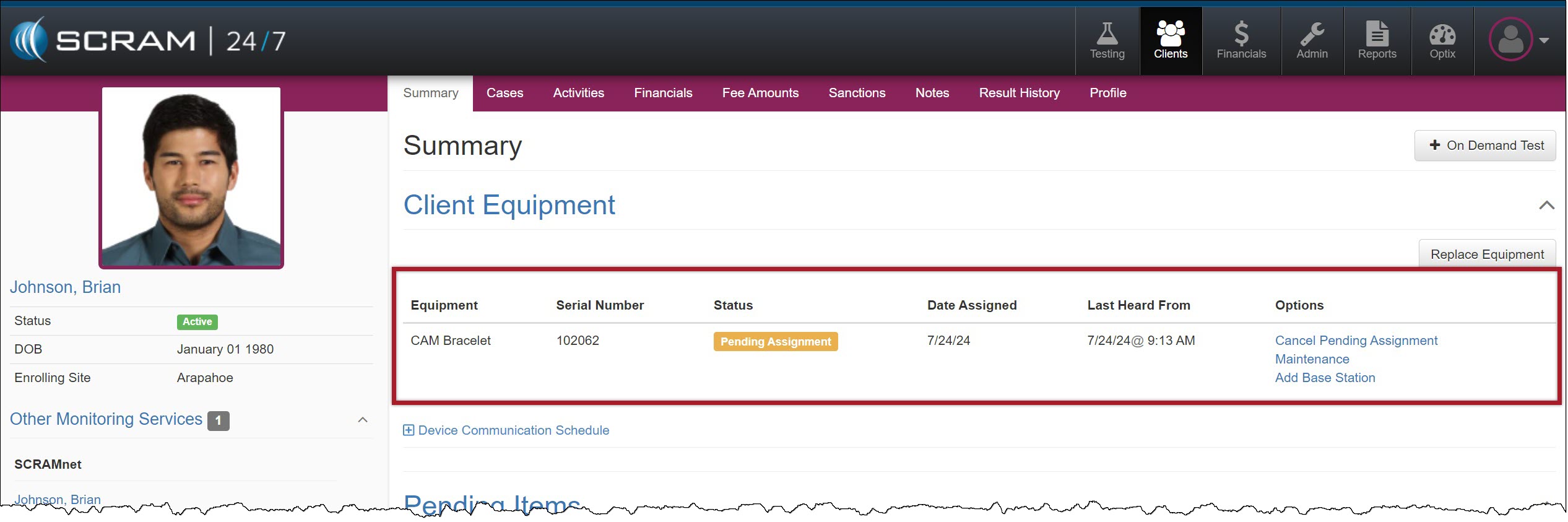 The Client Equipment section on the client’s Summary page displays the equipment in a “Pending Assignment” status.