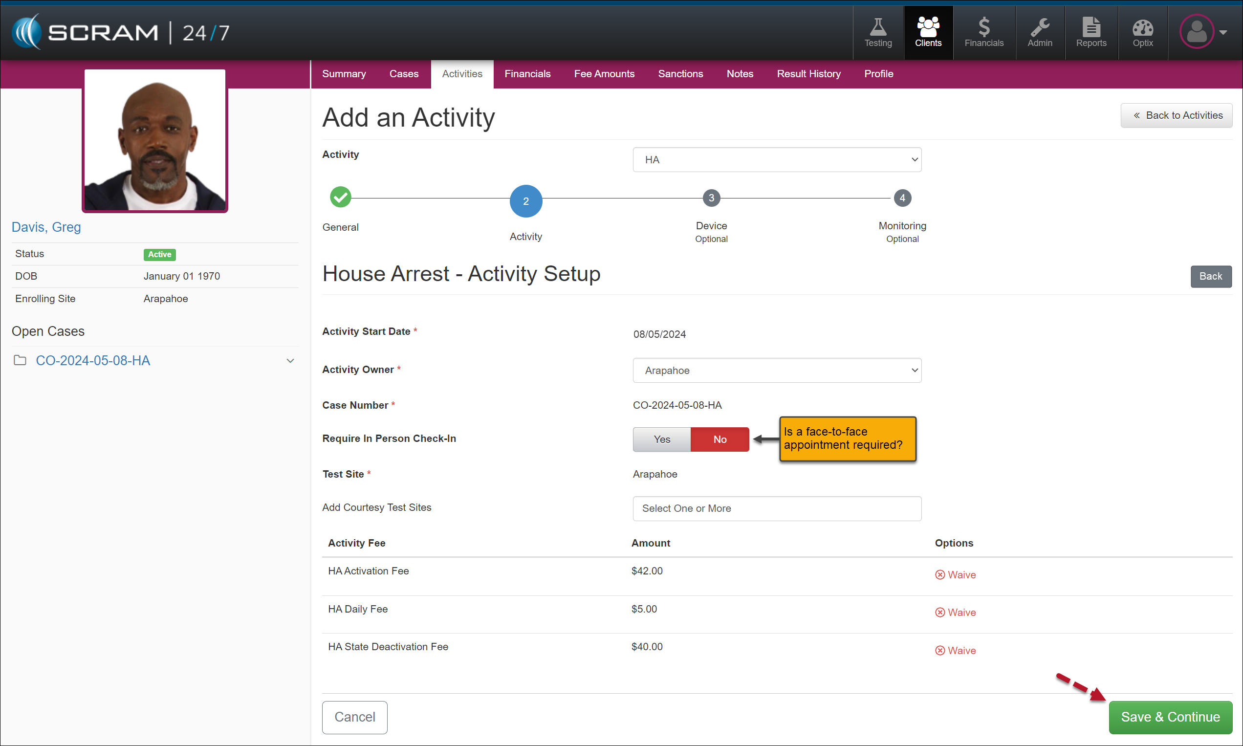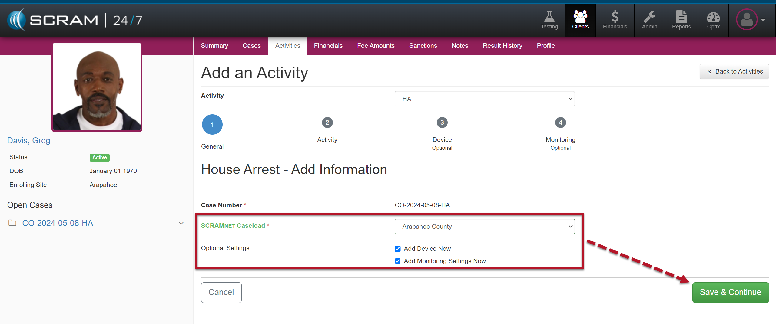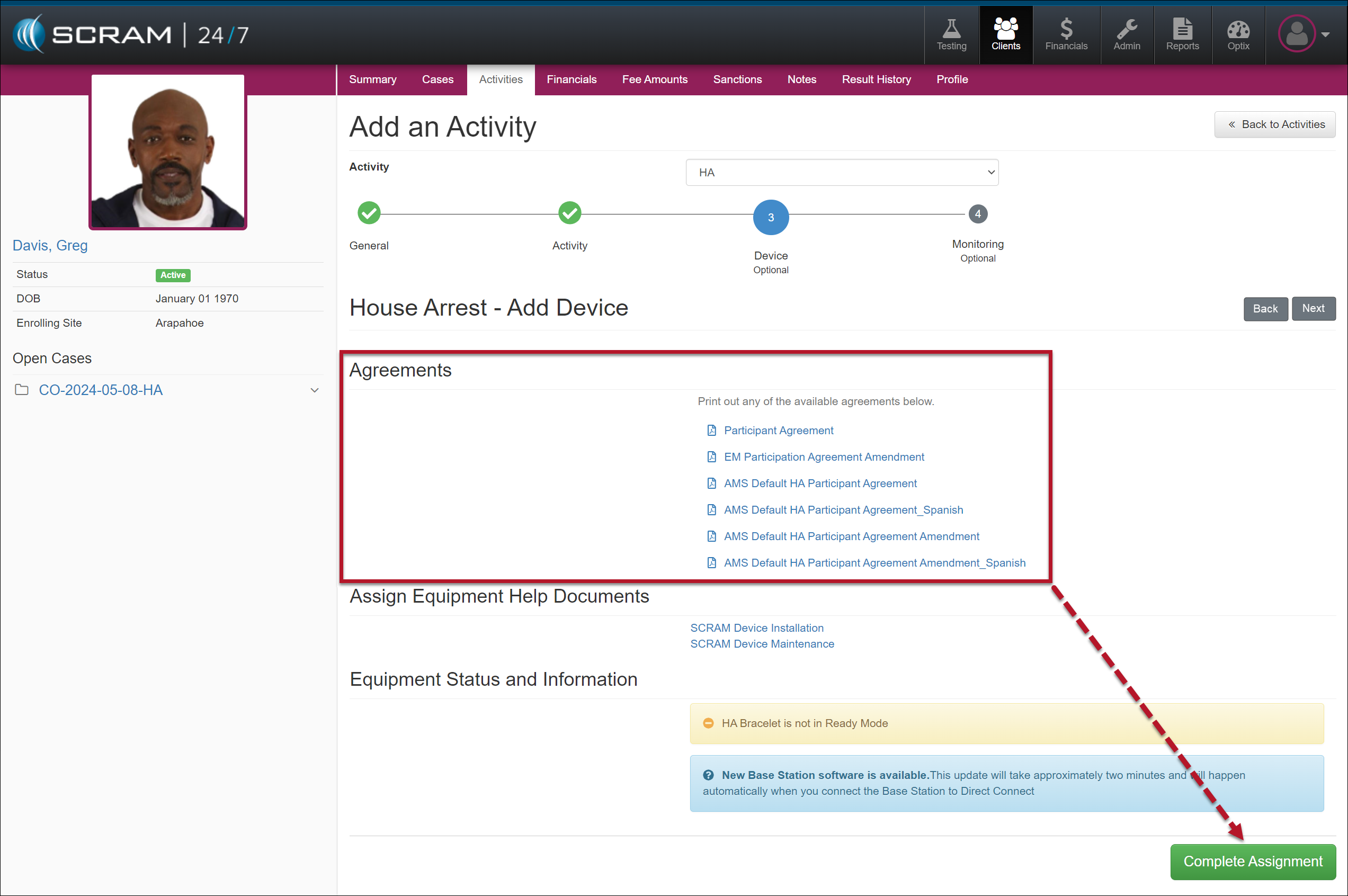 Once you have created the client’s profile in SCRAM 24/7, the next step is to add the House Arrest Activity and then complete the device assignment.