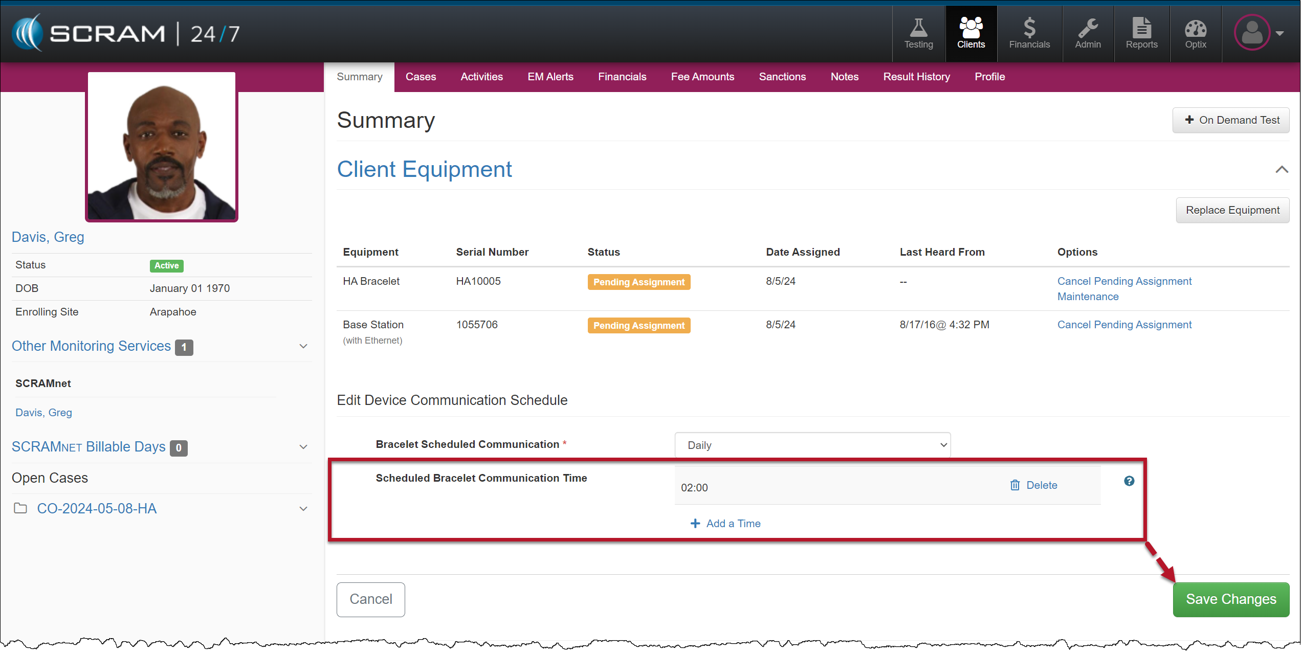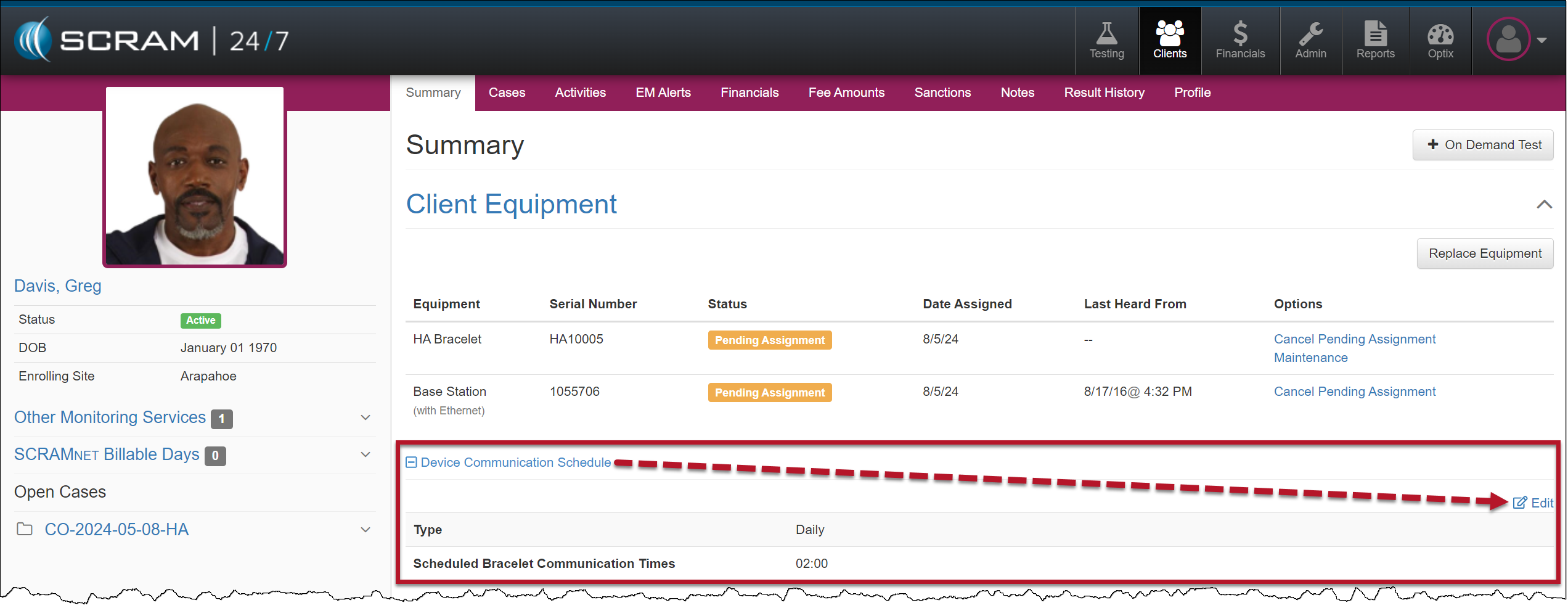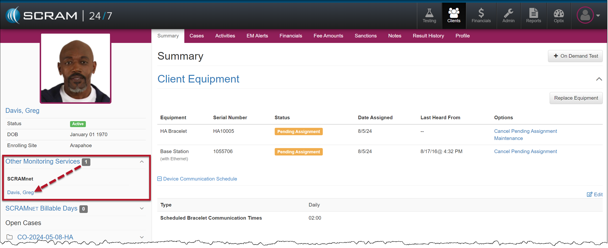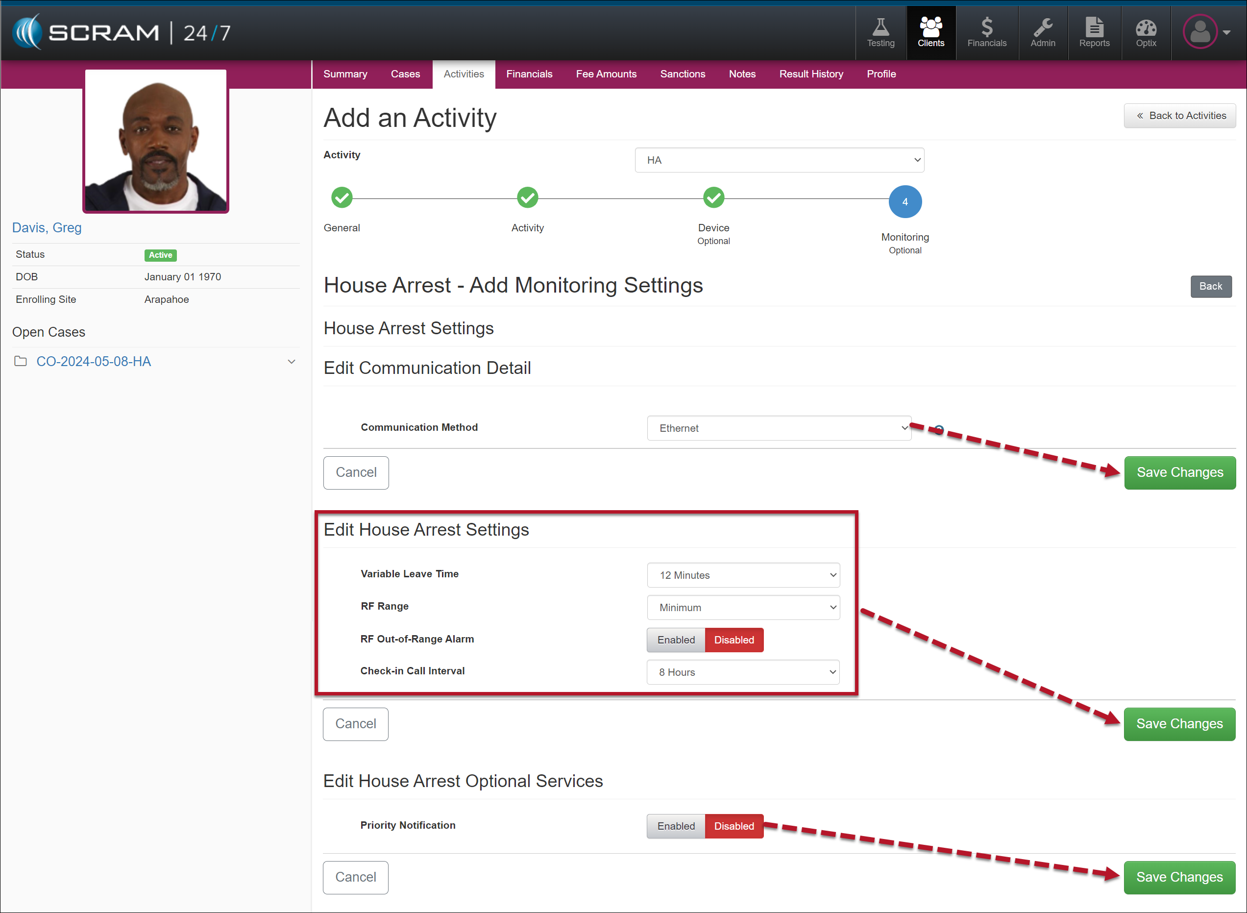 Once you have created the client’s profile in SCRAM 24/7, the next step is to add the House Arrest Activity and then complete the device assignment.