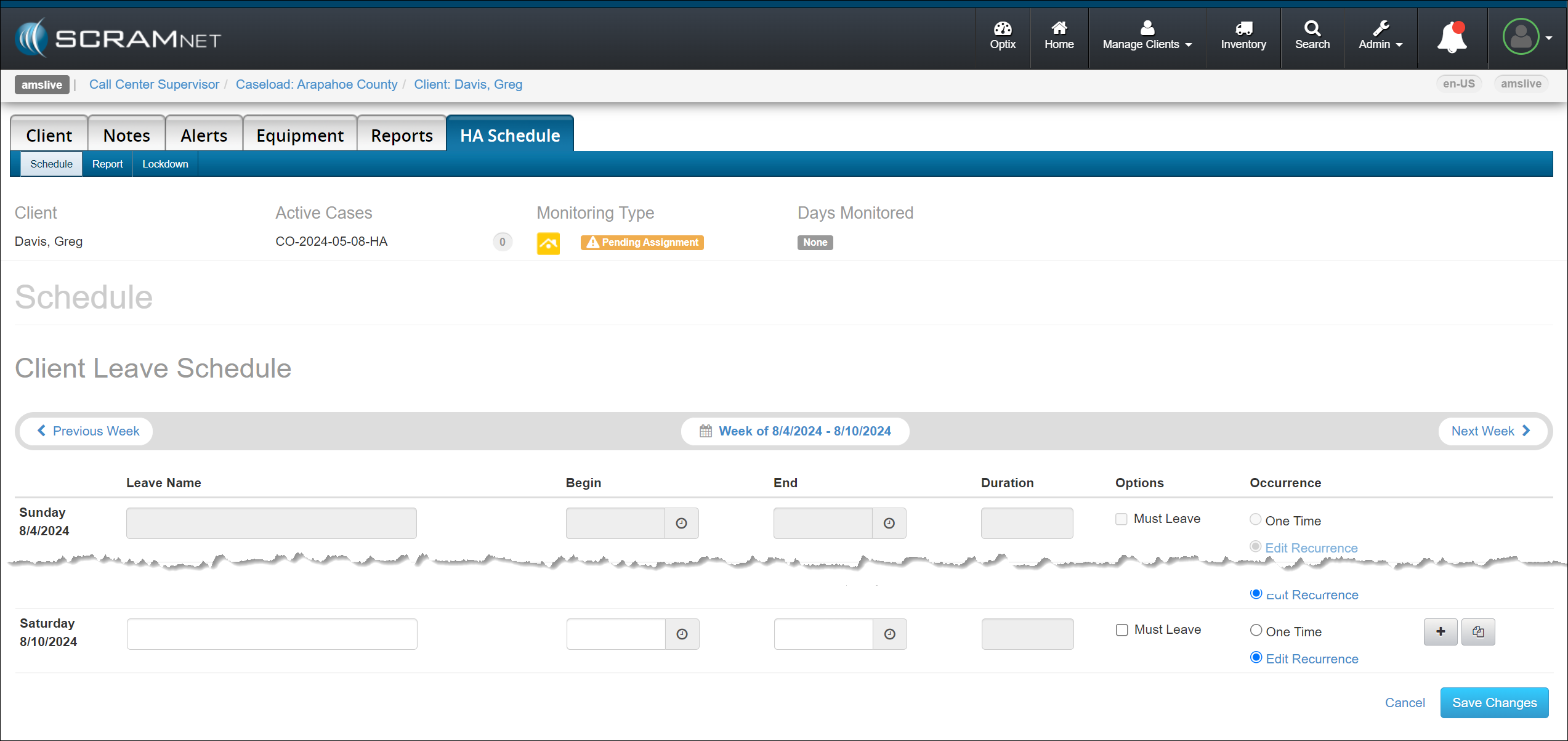 Within SCRAMNET, select the HA Schedule tab and create the client’s leave schedule.