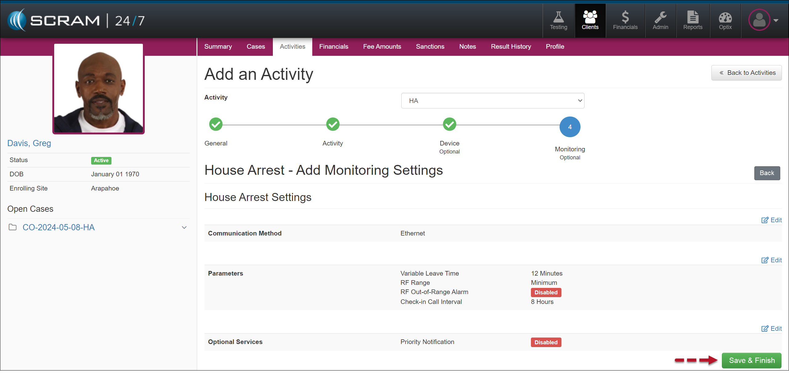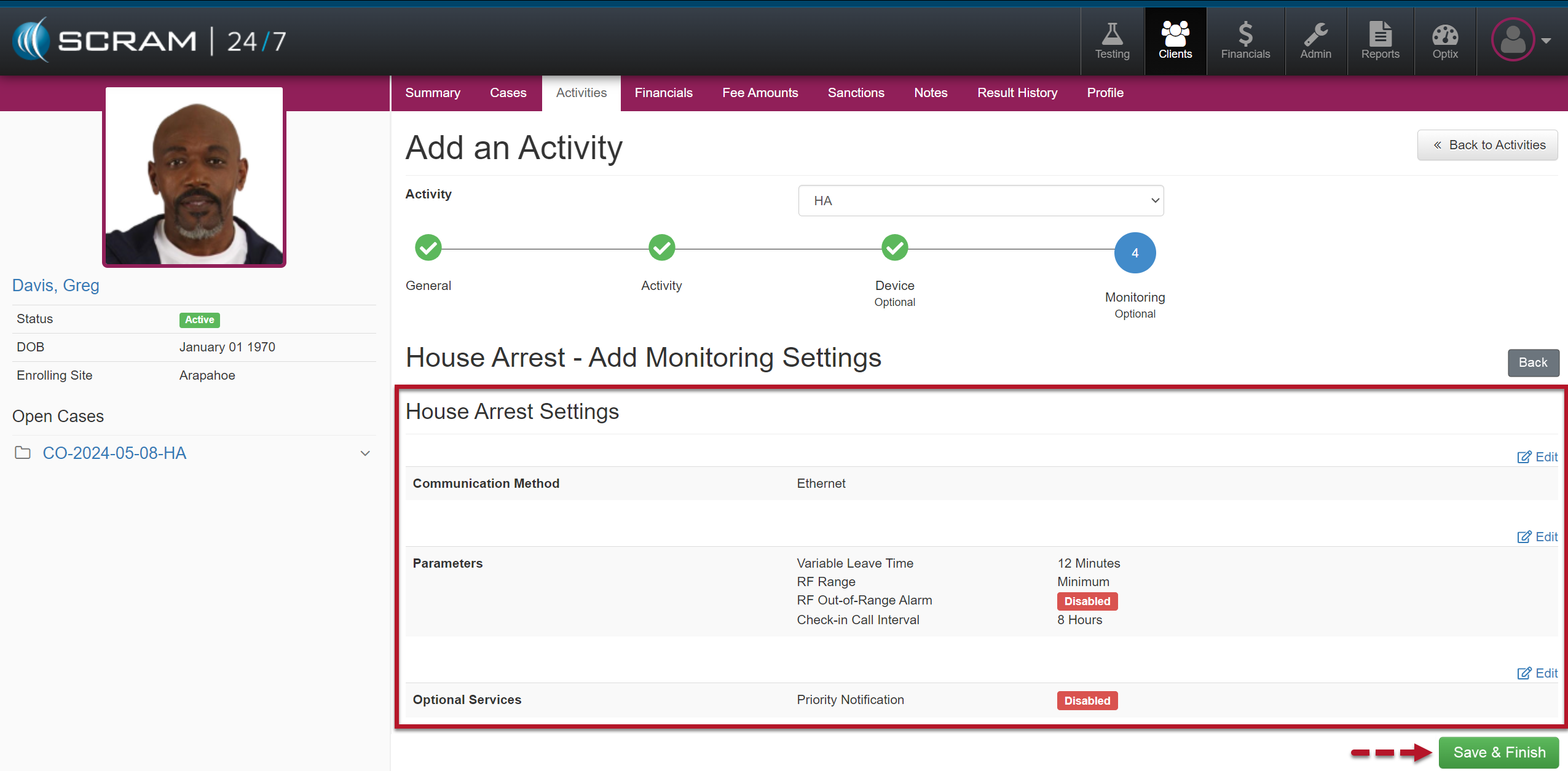 - On the Monitoring step, you may edit the default “House Arrest Settings” or enable “Priority Notification” for the client by selecting the Edit hyperlink next to the options. Select the Save & Finish button to save the Activity if that is not required.