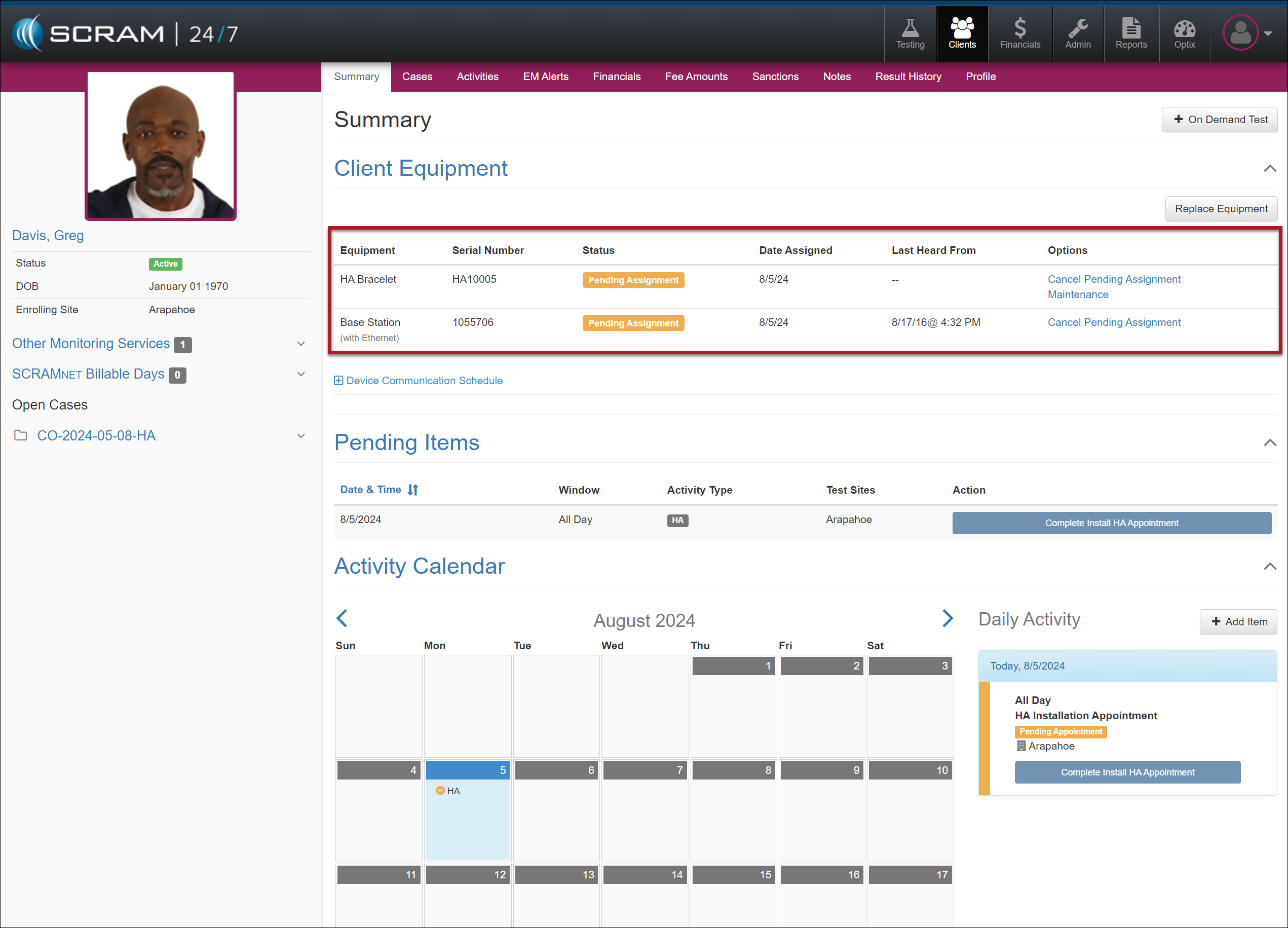 The Client Equipment section on the client’s Summary page displays the equipment in a “Pending Assignment” status.