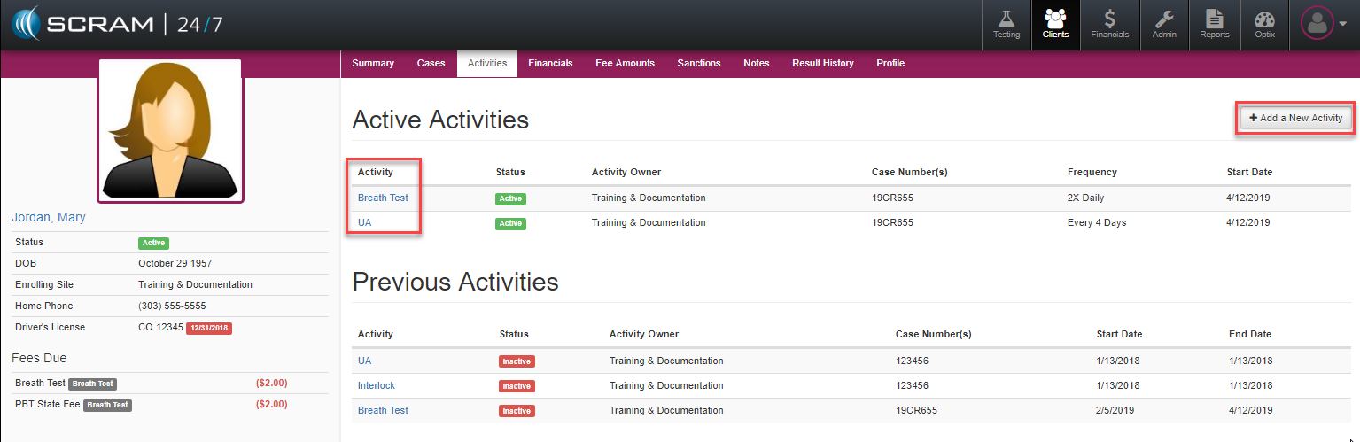 To review or modify the list of testing types a client is currently being supervised for, users can access that from the Activities tab. From there they will notice a table view of the activities the client is/has been supervised on including the status, the primary testing owner location, the case number the activity is tied to, testing frequency, and the starting date.