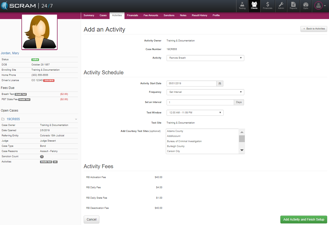 Once the testing activity and schedule has been set up, the officer can review the related fees and complete the process by selecting the green Add Activity and Finish Setup button.