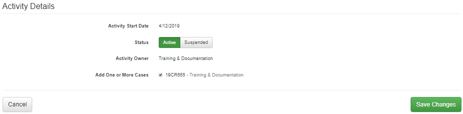 To modify or suspend an activity while a client is in the program, simply select the edit link adjacent to the Activity Details subtopic title which will open the Status selection where the Active or Suspended action can be made and saved.