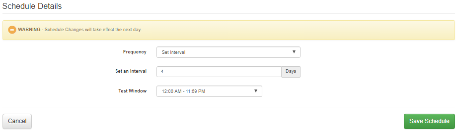 To modify the testing schedule, select edit of the Schedule Details menu. From there either a set schedule or interval cadence of scheduling can be selected and saved. The new schedule will go into effect starting the next day.