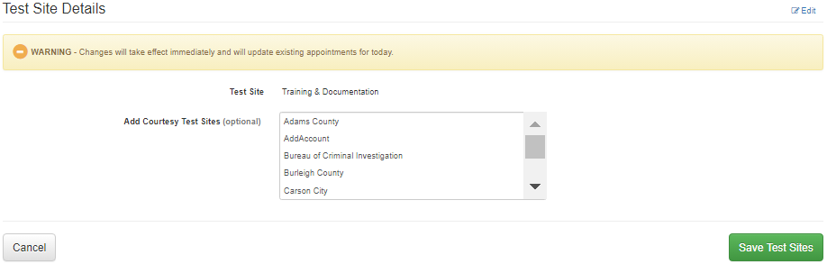 By editing the Testing Site Details, users can select or modify any additional testing sites that may be required to support the client’s testing such as setting up alternative courtesy testing sites.