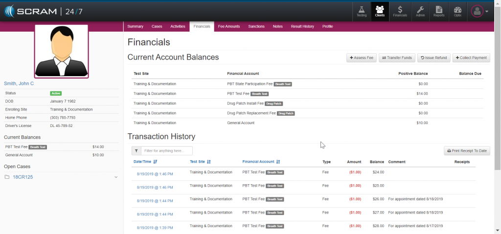 The Transaction History table displays a ledger of all of the financial transactions that have occurred with the client. The Date/Time, Test Site, Financial Account, Type of Fee or Payment, transaction Amount, running Balance, Comments, and Receipt numbers are all listed in ledger form. Date, Time, Test Site, and Financial Account columns may be sorted, as well as an open text query filter is provided for text sensitive searches.