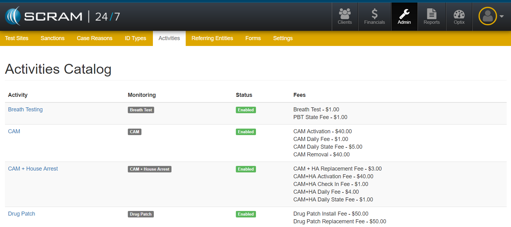 The Admin tab, accessible by the black crescent wrench icon, provides departmental administrators (special license permissions) the ability to configure a number of 24×7 parameters and policies related to how the Department’s sobriety program management . Among the elements that can be added, modified or removed are: