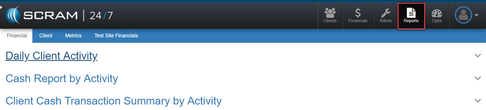 - Financial: Daily Client Activity, Cash Report By Activity, and Client Cash Transaction Summary by Activity