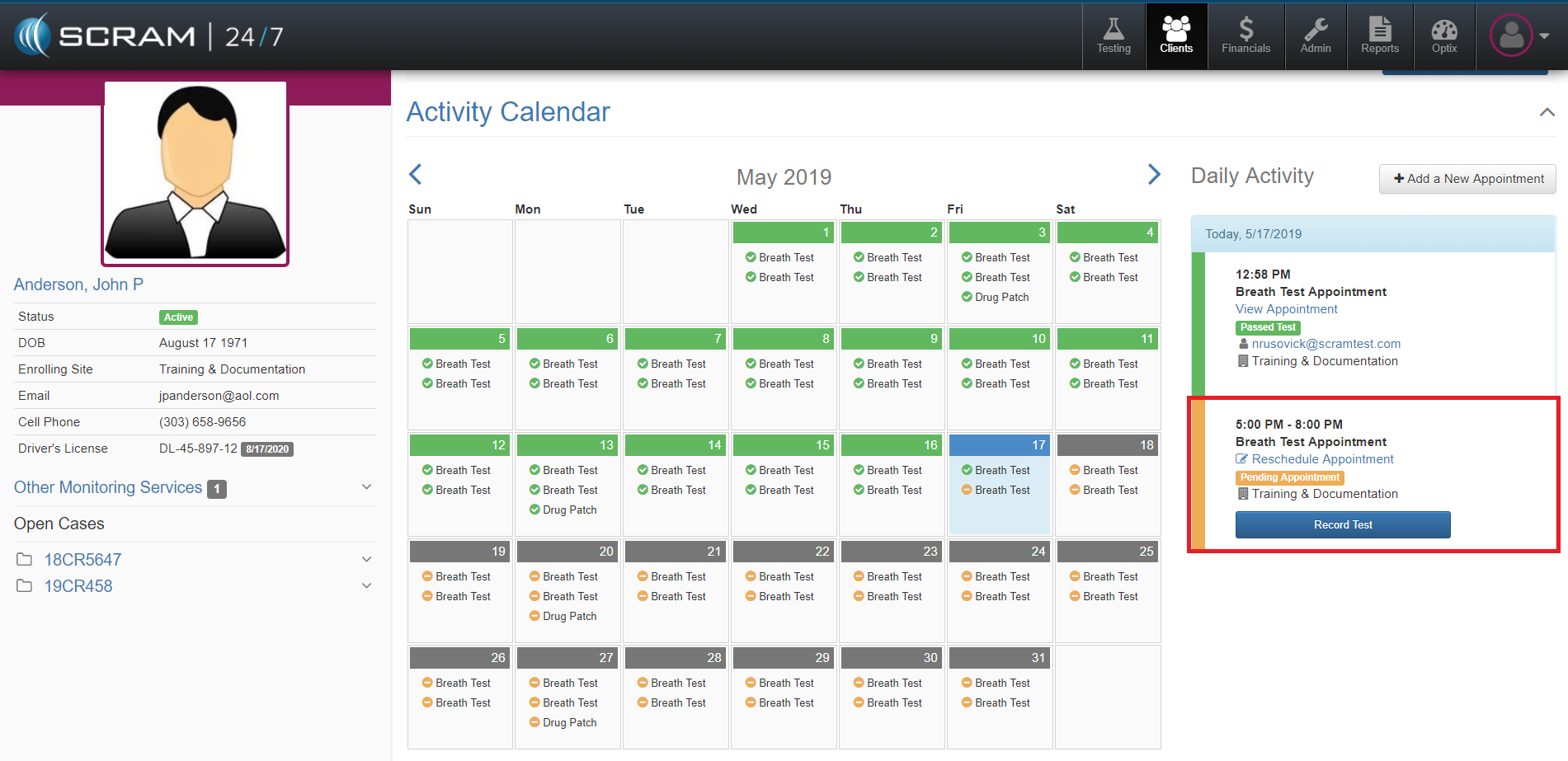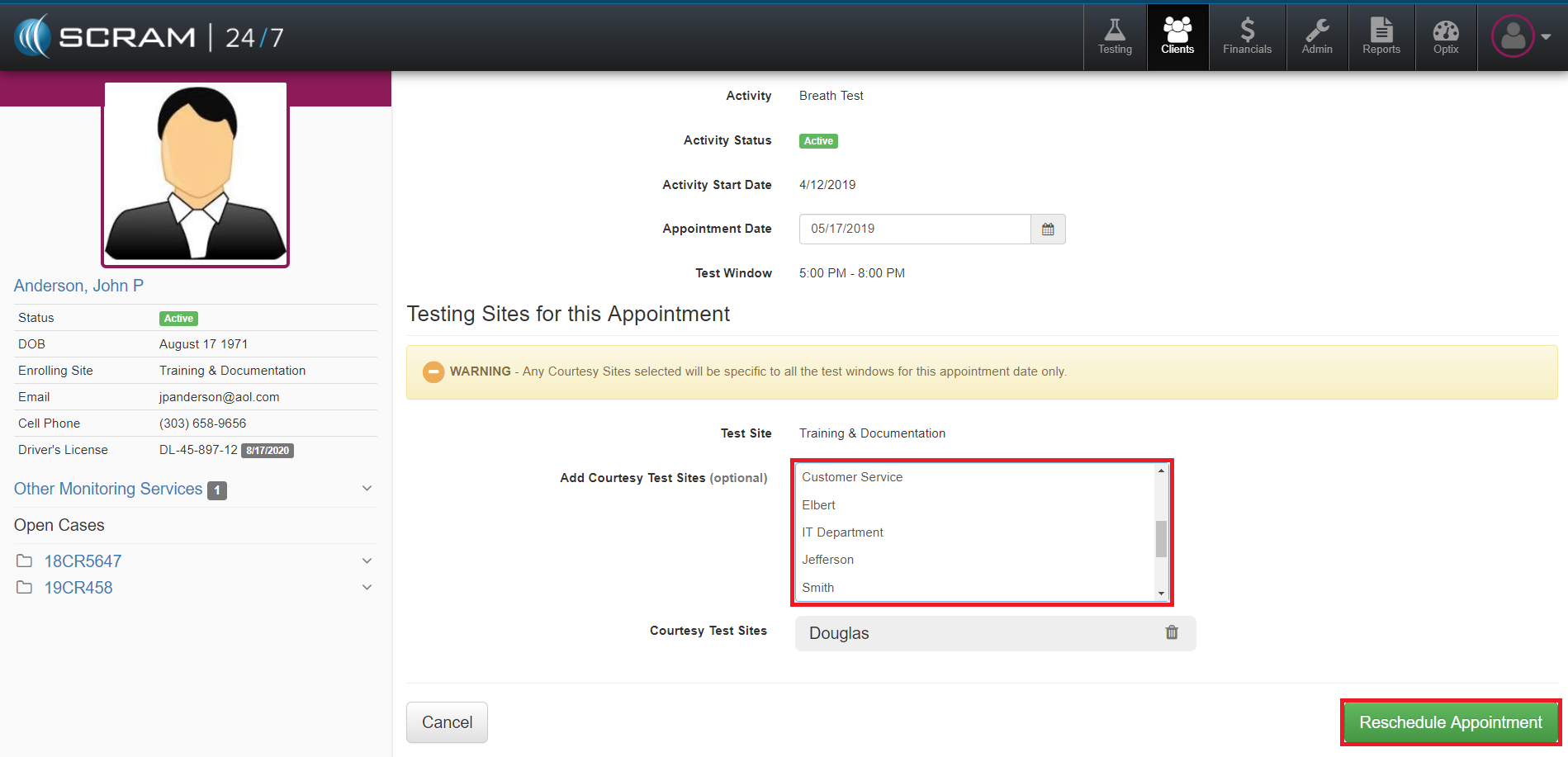 To add a Courtesy Test Site for a one-time occurrence, navigate to the Client’s Activity Calendar and select the Reschedule Appointment link for that specific test or appointment. Next, select the preferred Courtesy Test Site location and then select the Reschedule Appointment button.