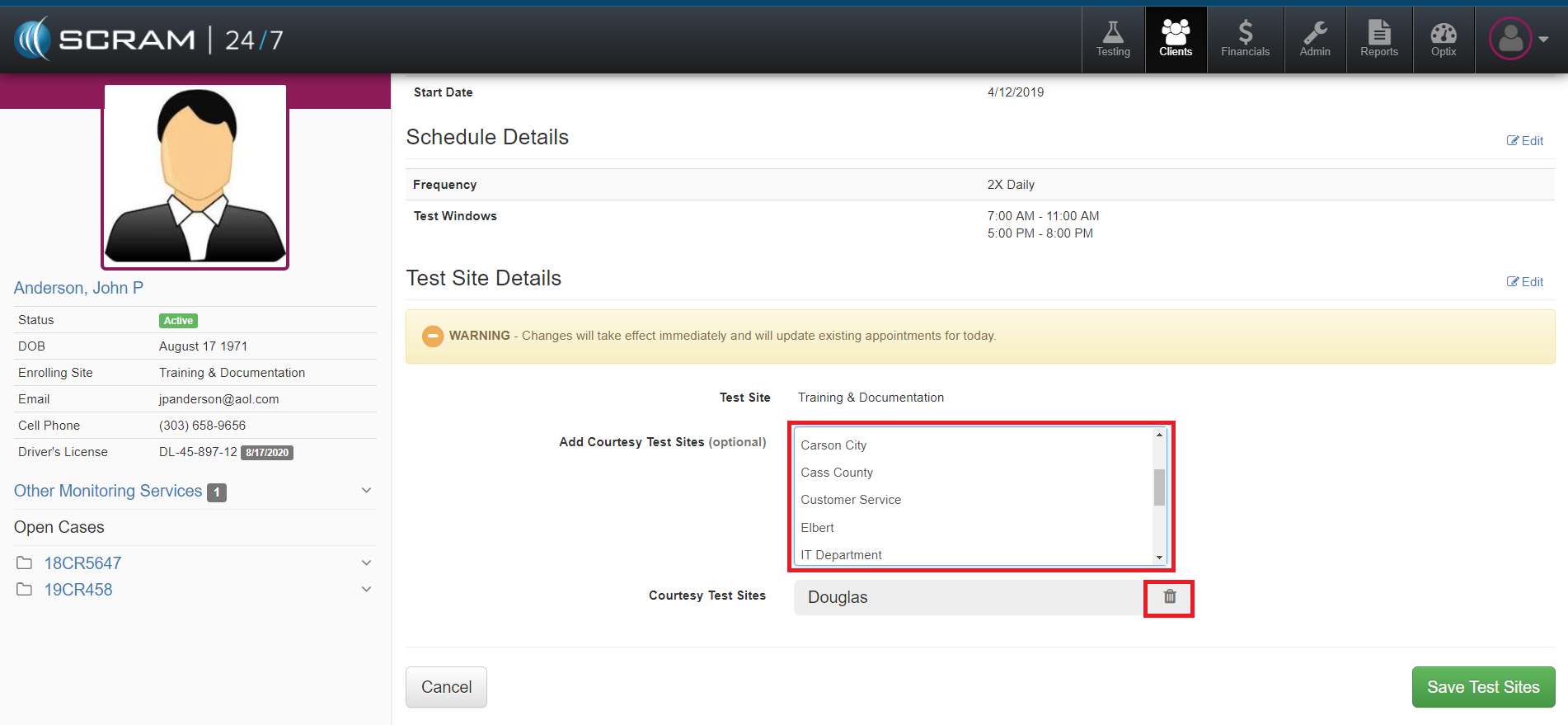 To Remove a Courtesy Test Site, open the Test Site Details and select the trash can next to the Courtesy Test Site location you want to remove.