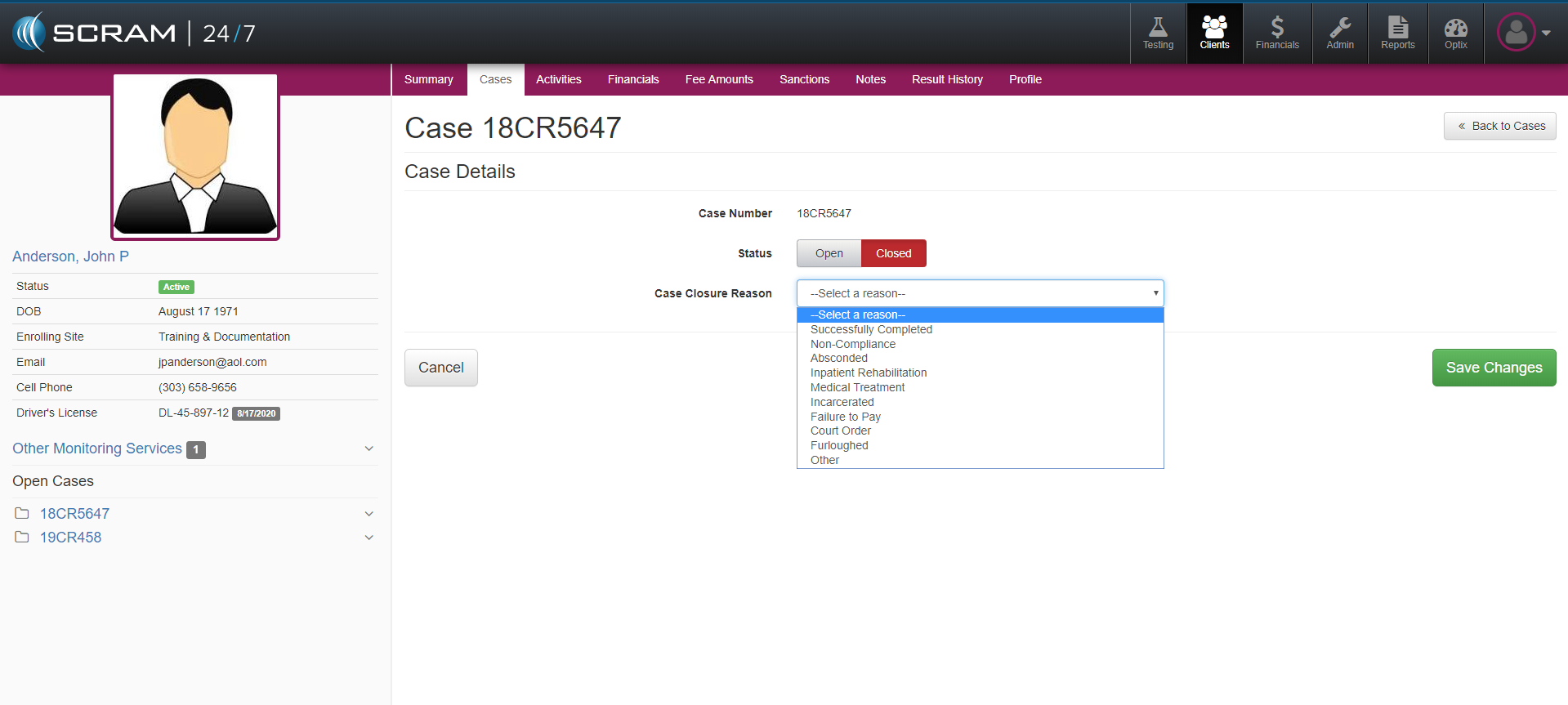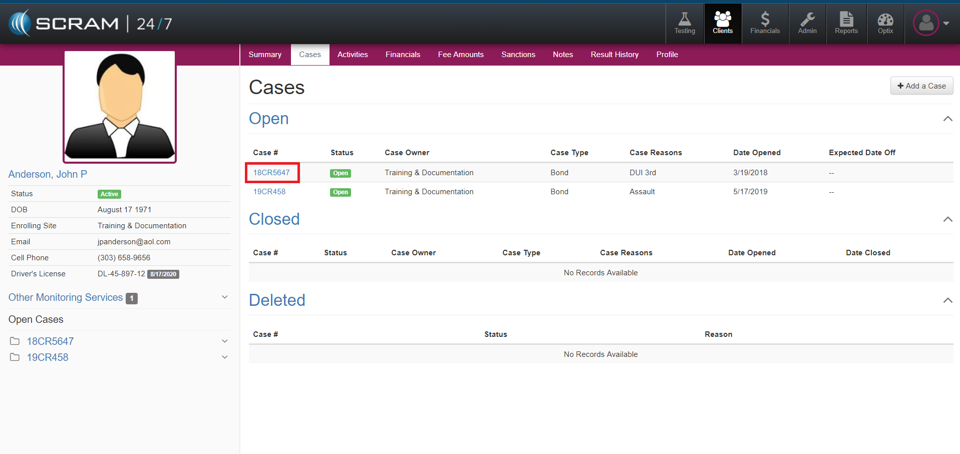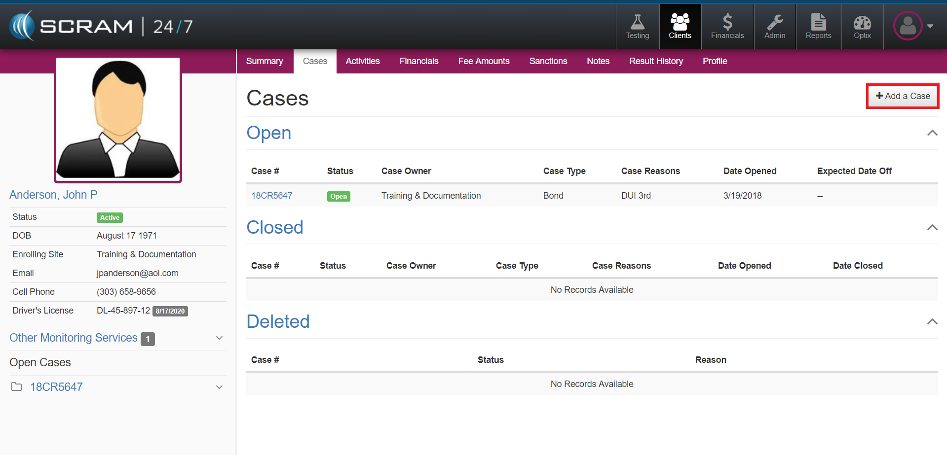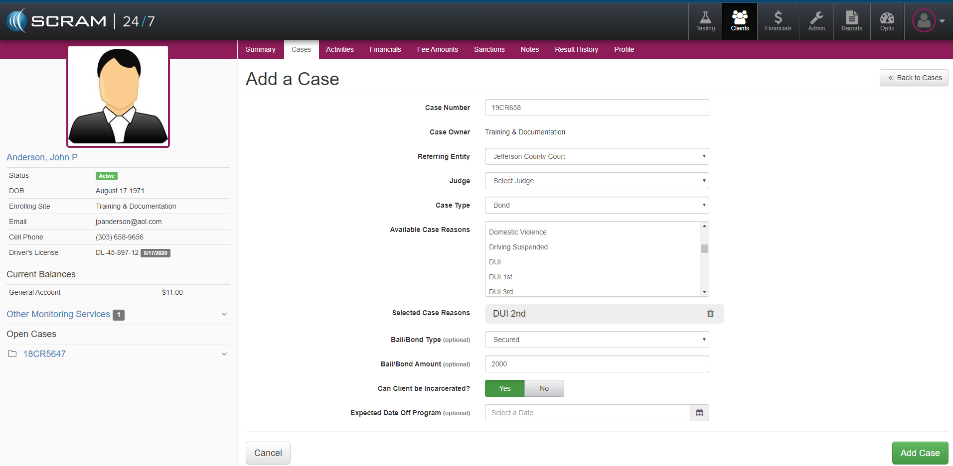 It is not uncommon for a Client to have more than one case while being supervised on 24/7 monitoring. To add an additional case for a Client in SCRAM 24/7, navigate to the Clients Cases tab and select the +Add a Case button. Next complete the corresponding fields and then select the green Add Case button.