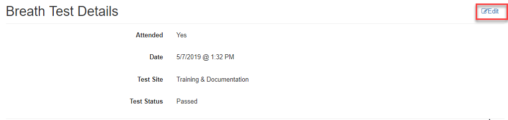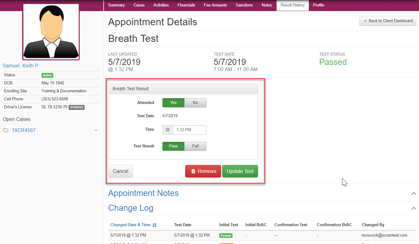 Once the appointment is opened, the Appointment Details page will open and by selecting the blue Edit button to the test details, the appointment or the results can be edited either for removal or updating. Note: Any changes made will be captured and timestamped in the Change Log.