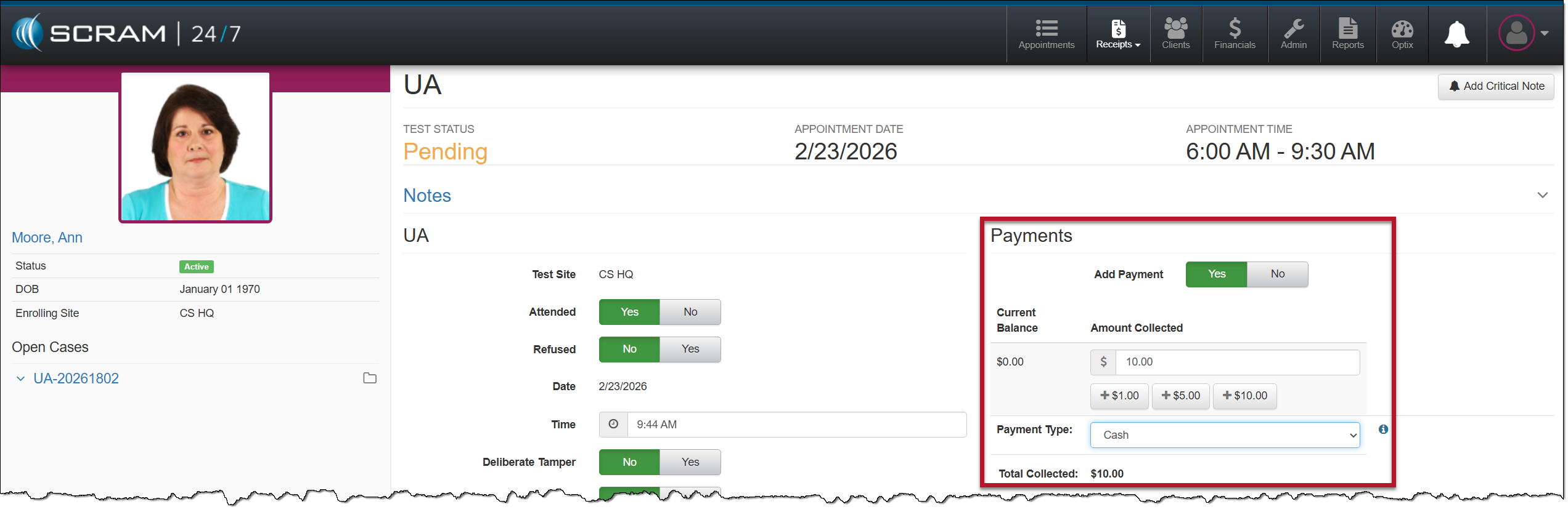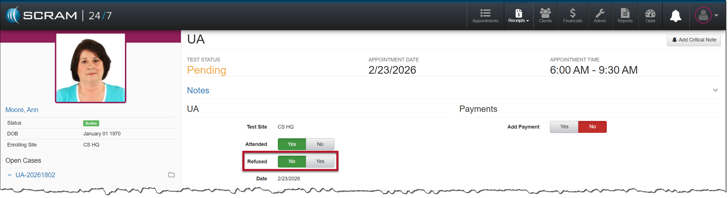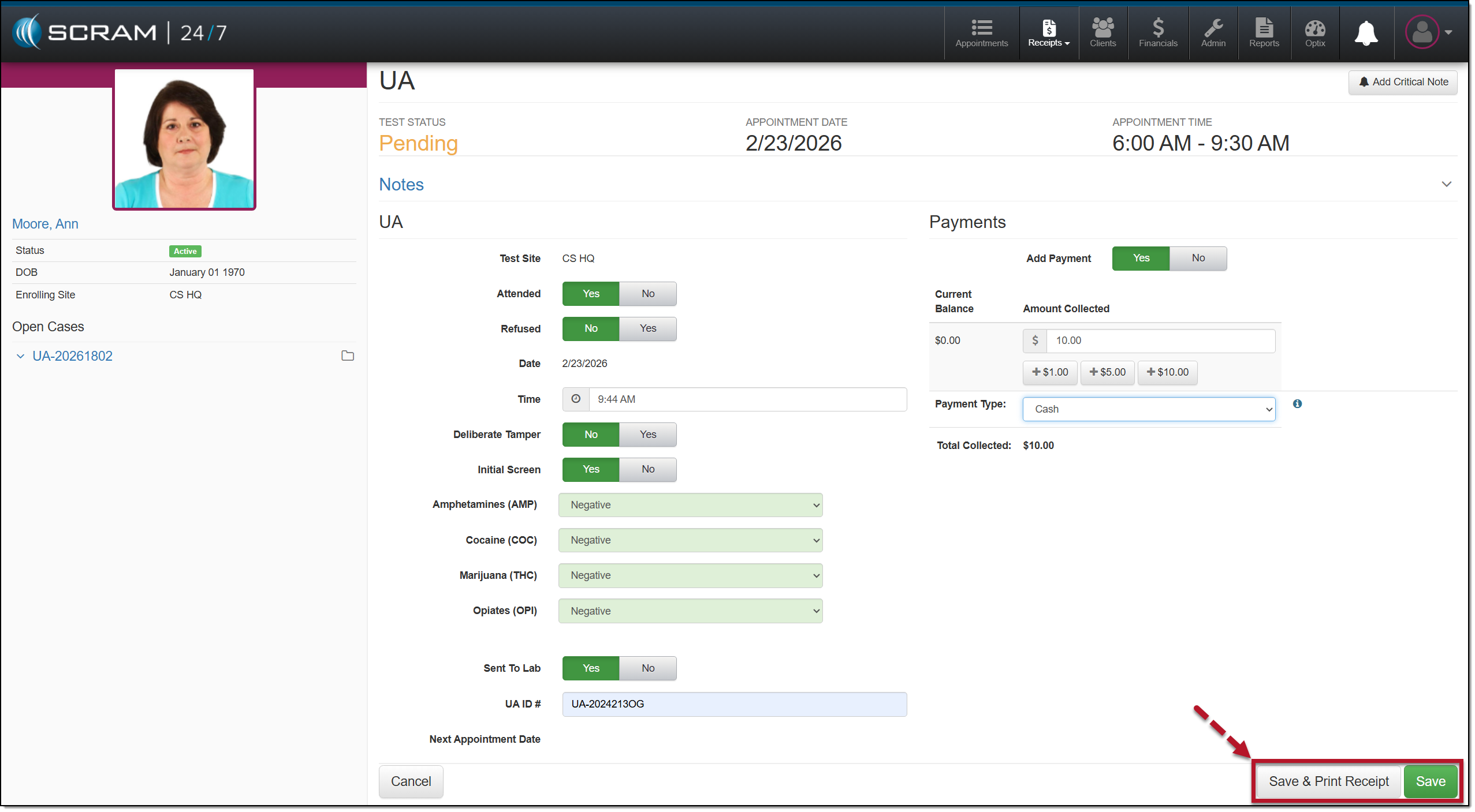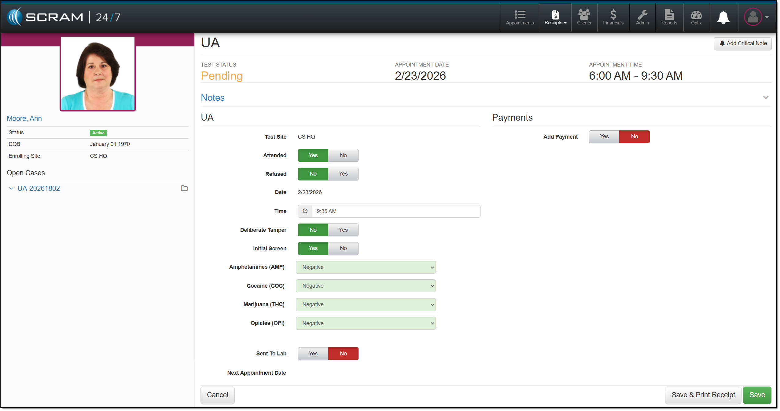 When recording a client’s UA appointment, you will record the client’s attendance, the initial UA screening and results (if available), whether the sample was sent to a lab for analysis, the next appointment, and any payment collected. Based on your selections, the options available on the page will be updated.