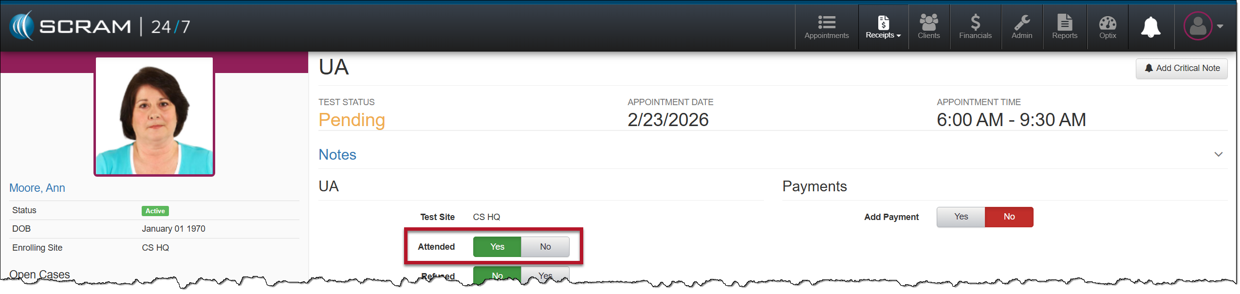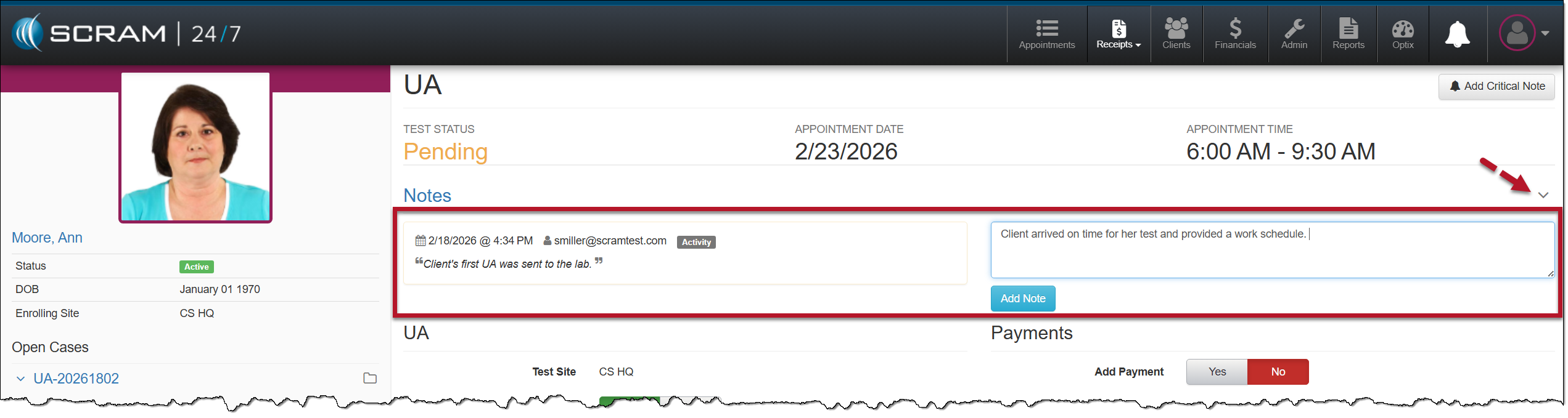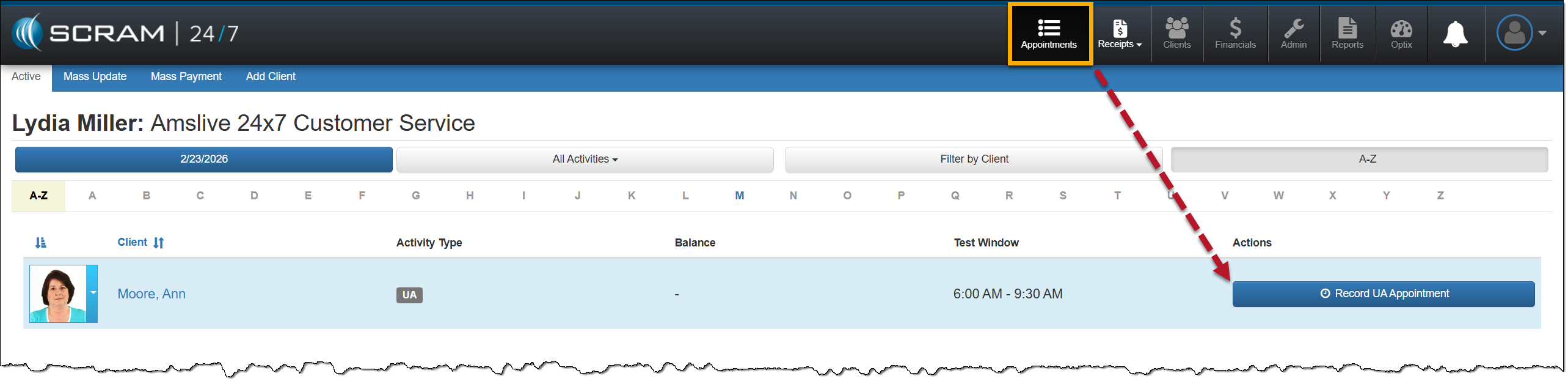 You may access the client’s UA appointment by selecting the Record UA Appointment from either the Appointments page or from their Summary page in the Pending Items section.