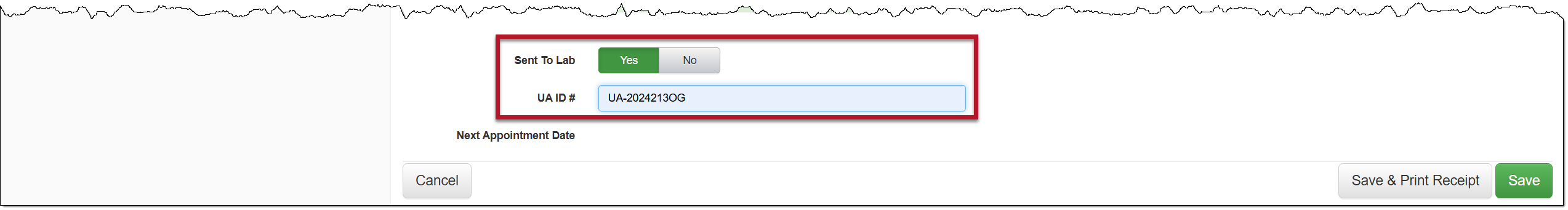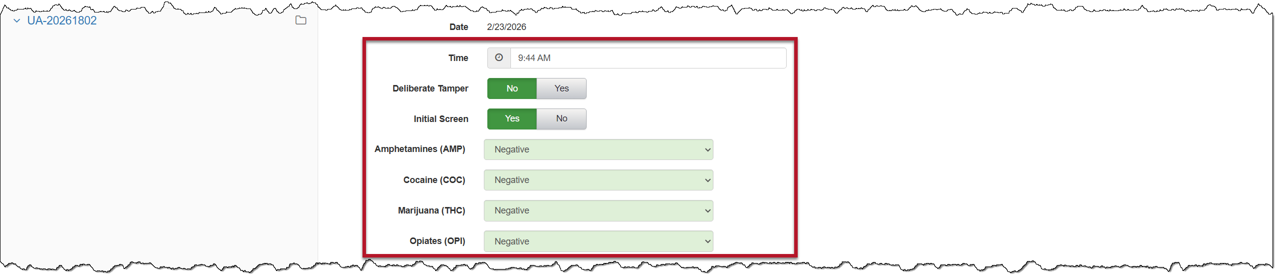 - If the UA sample will be sent to a lab for analysis, select the Yes Once selected, enter the UA ID# that will identify the sample. This ID number will be used to record the sample upon its return.