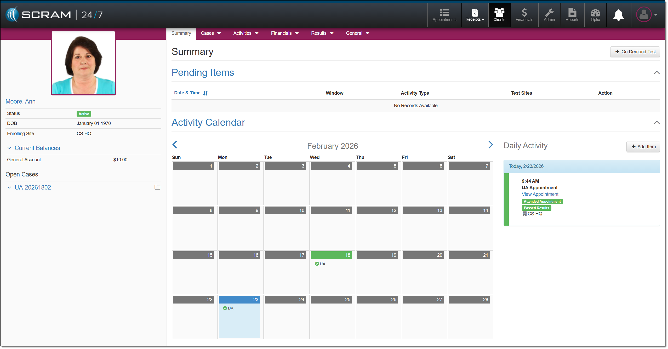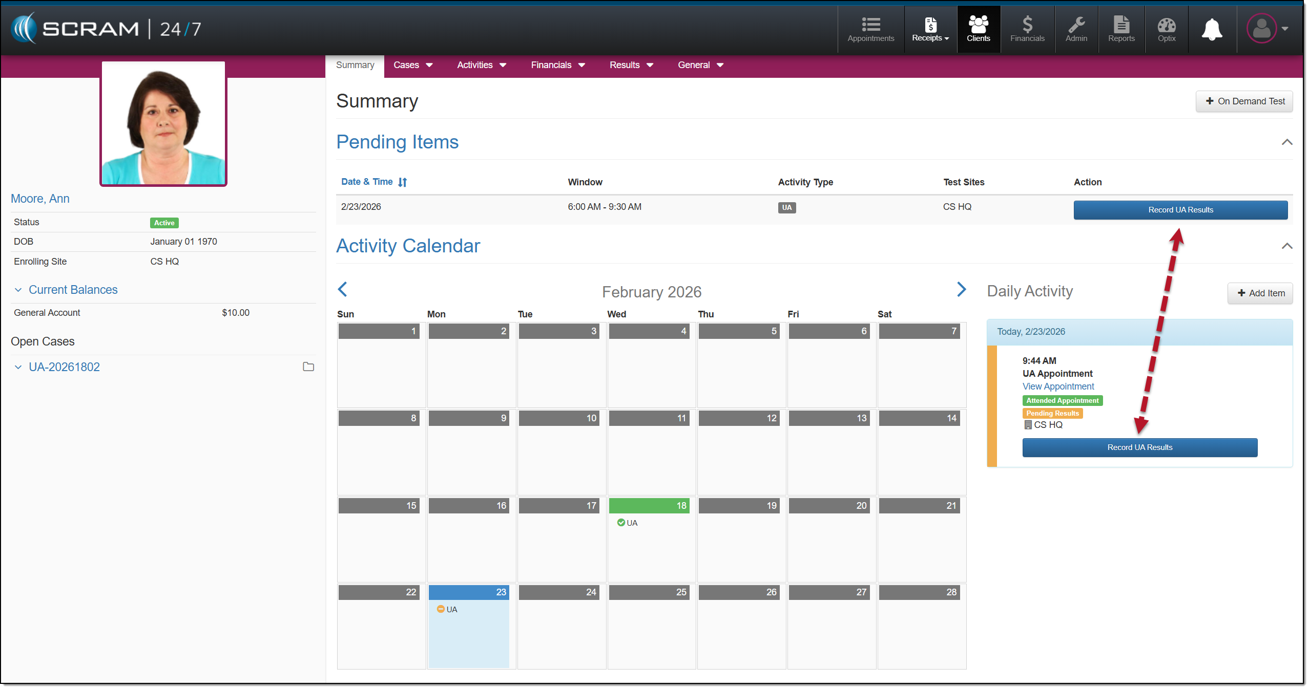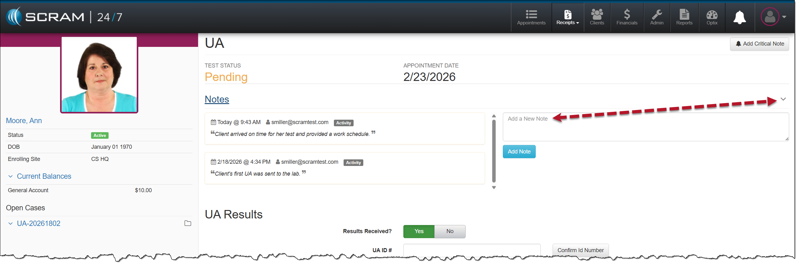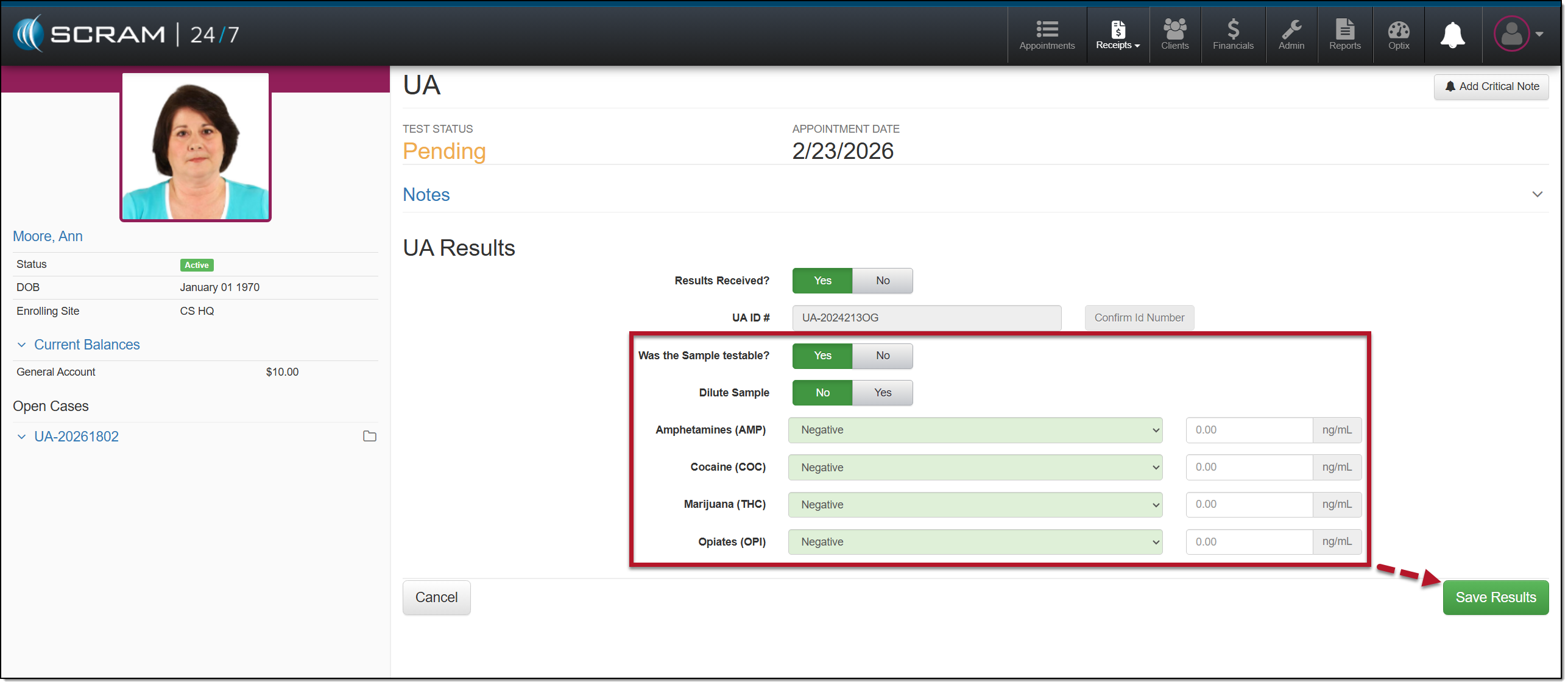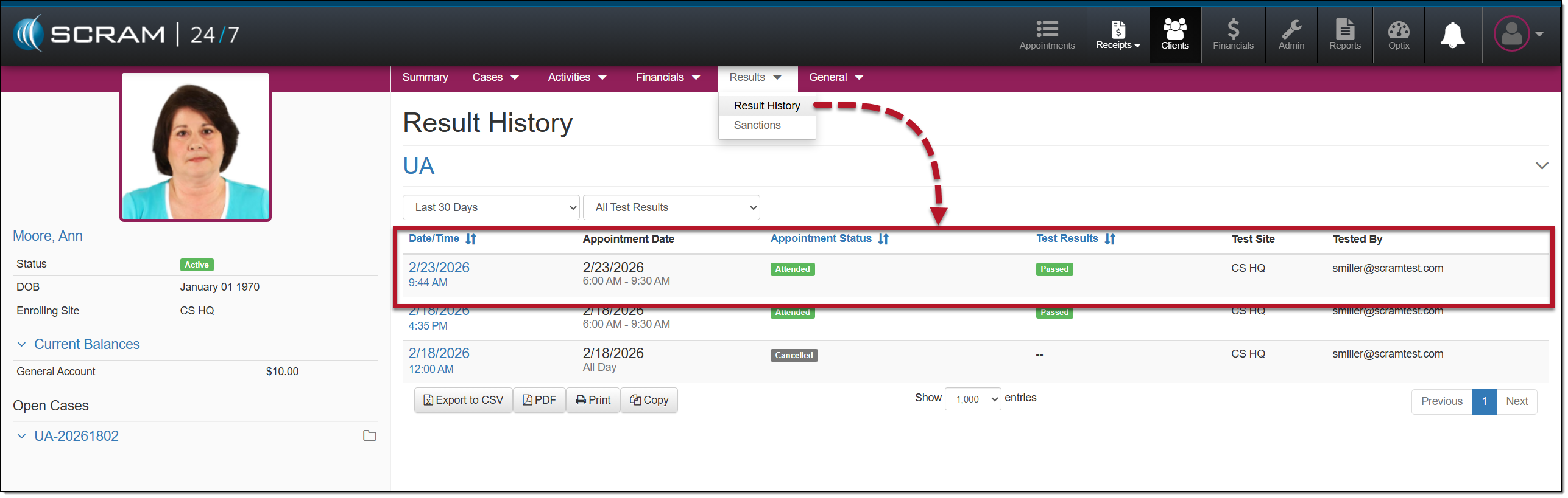You may view the client’s UA appointment and test results on the Result History page.