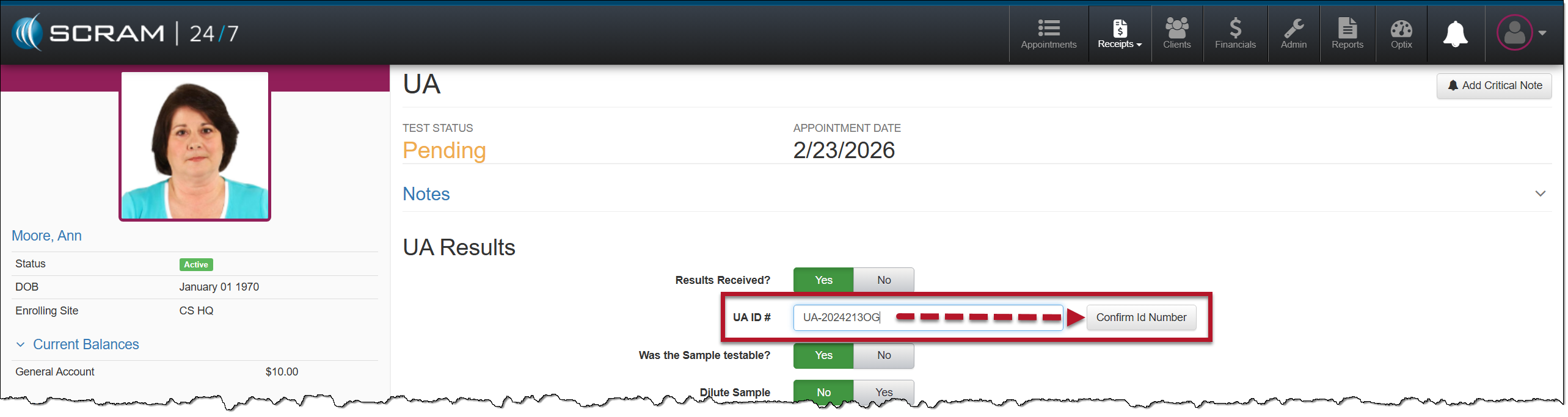 - Enter the UA ID number and select the Confirm ID Number This UA ID# is a security measure to ensure that the UA results are associated with the correct client.
