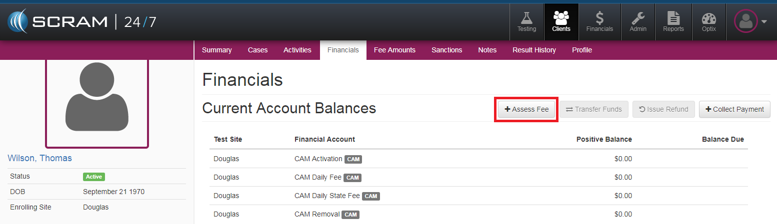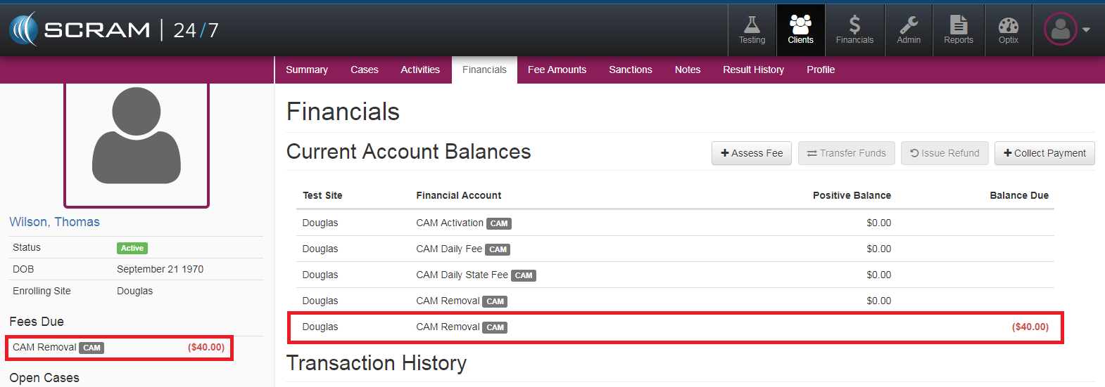 The fee assessed now appears in the Current Account Balances section of the Financials page and in the client’s profile area.