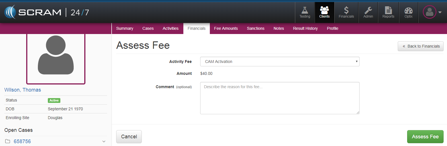 The client’s Financials page appears with a new Assess Fee button added, as shown below.
